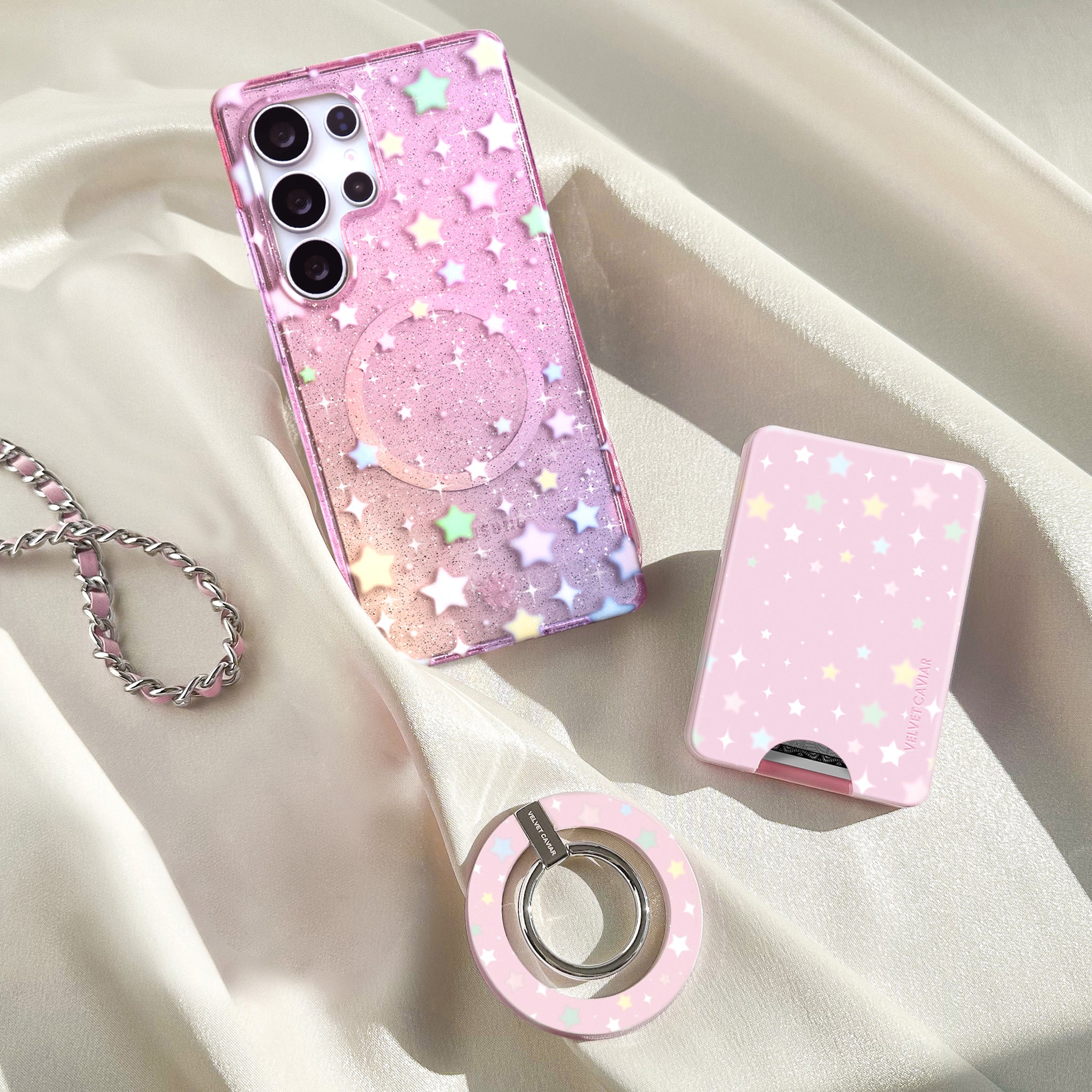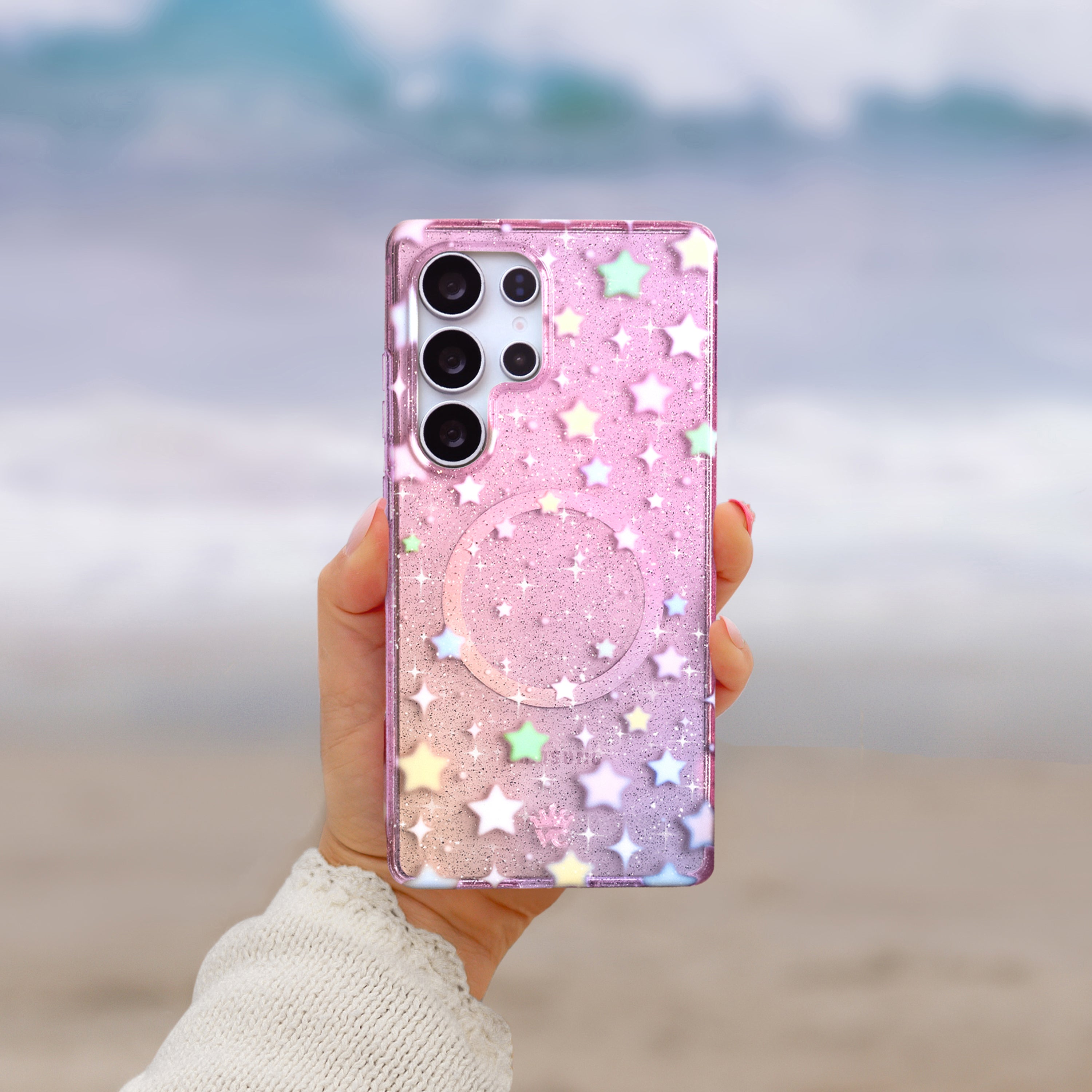 You're a star! This protective case features stunning pastel stars scattered on a clear ombre sunset base with silver stardust glitter sprinkled throughout the base and bumper.