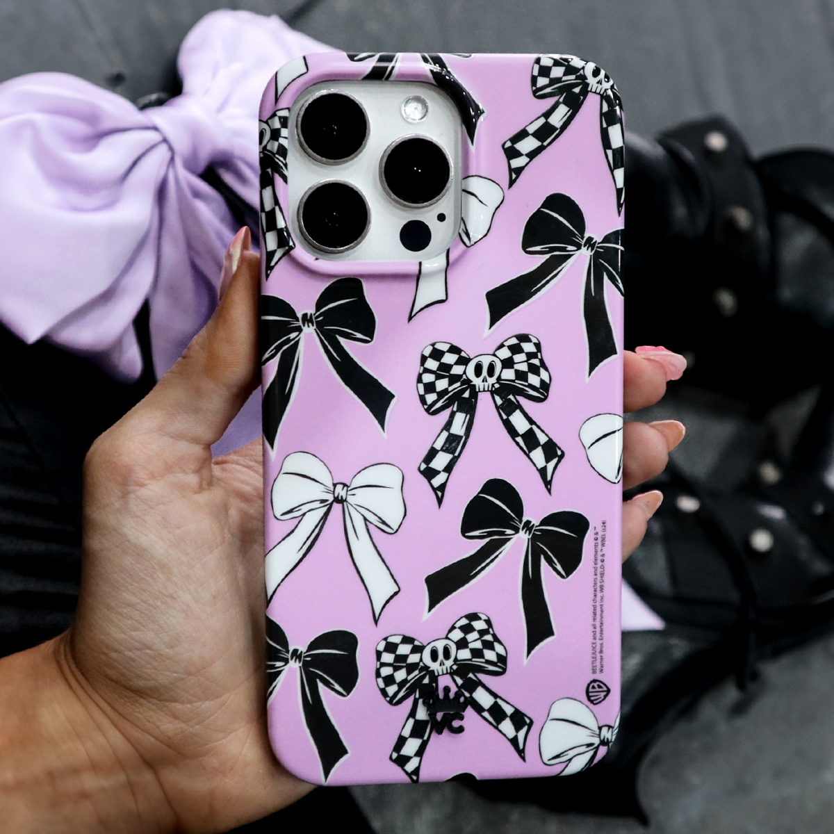 Gore-gous Gore-gous Ghouls! This MagSafe case features an array of glossy black and white bows on a matte lavender base with a contrasting black bumper.