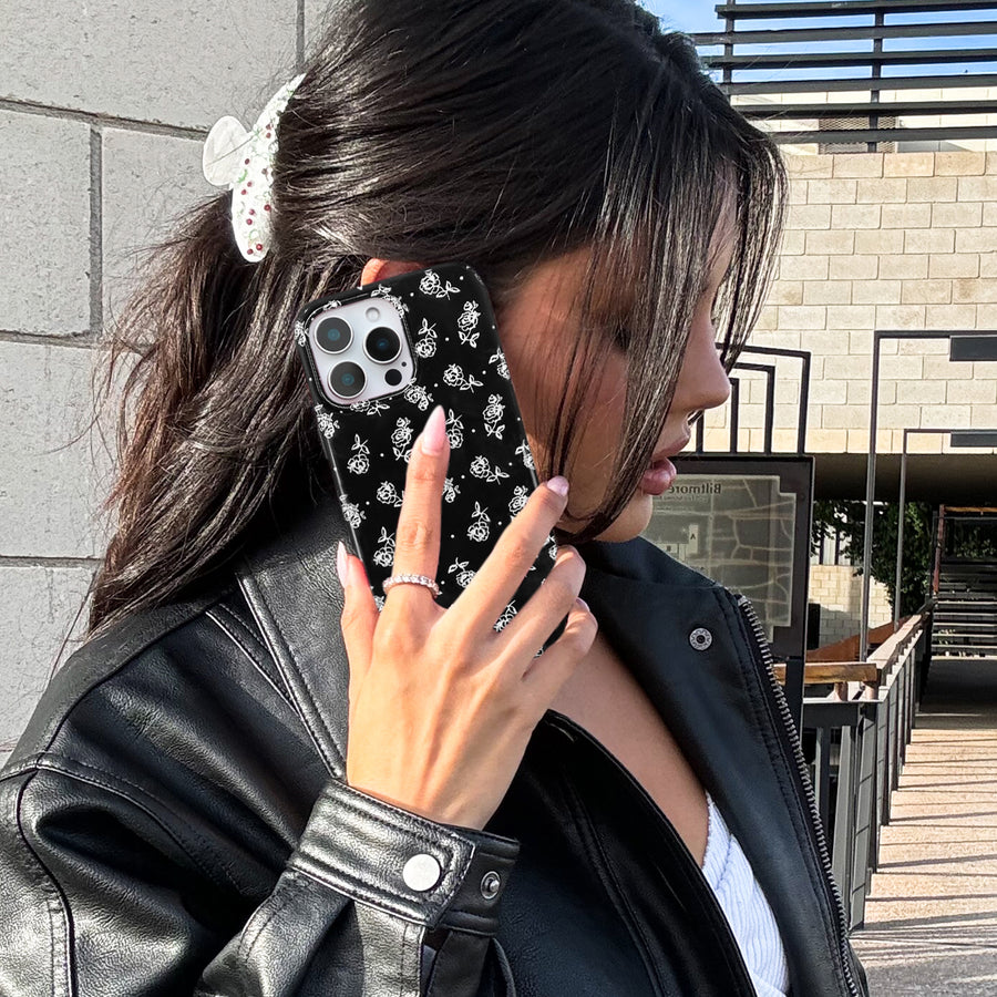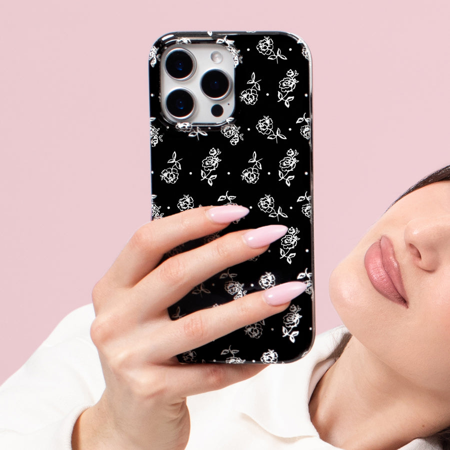 Classic and chic! This glossy MagSafe case features a 90's inspired white floral pattern and small polka dots on a black base with a monochromatic black bumper.