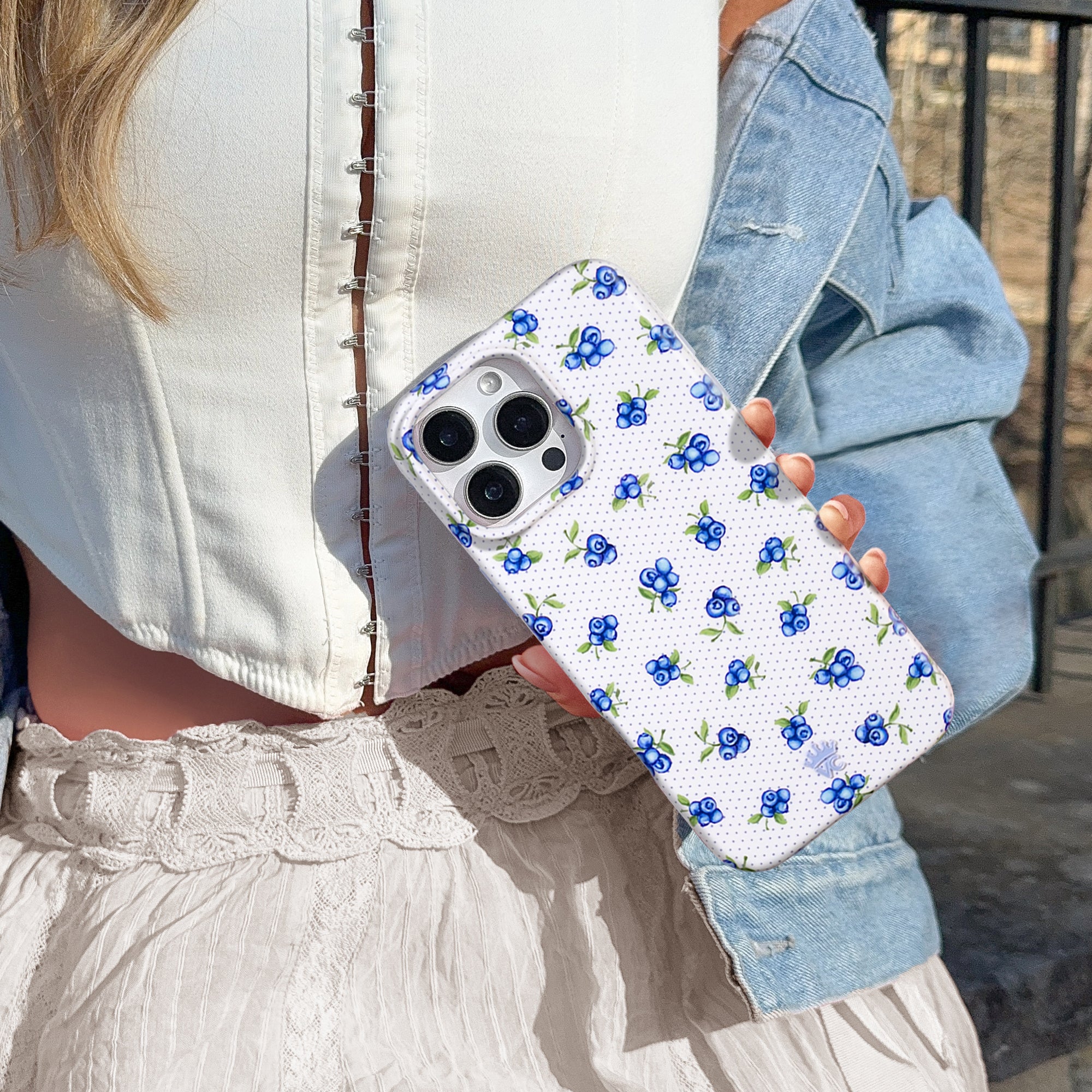 So berry cute! This Limited Edition MagSafe case features an array of watercolor blueberries on a glossy white base with small polka dots throughout and a light blue bumper.