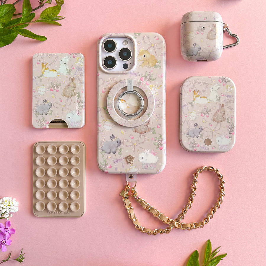Some bunny loves you! This MagSafe case features adorable hand drawn bunnies, bows, strawberries, and tea cups all on a neutral beige base and bumper.