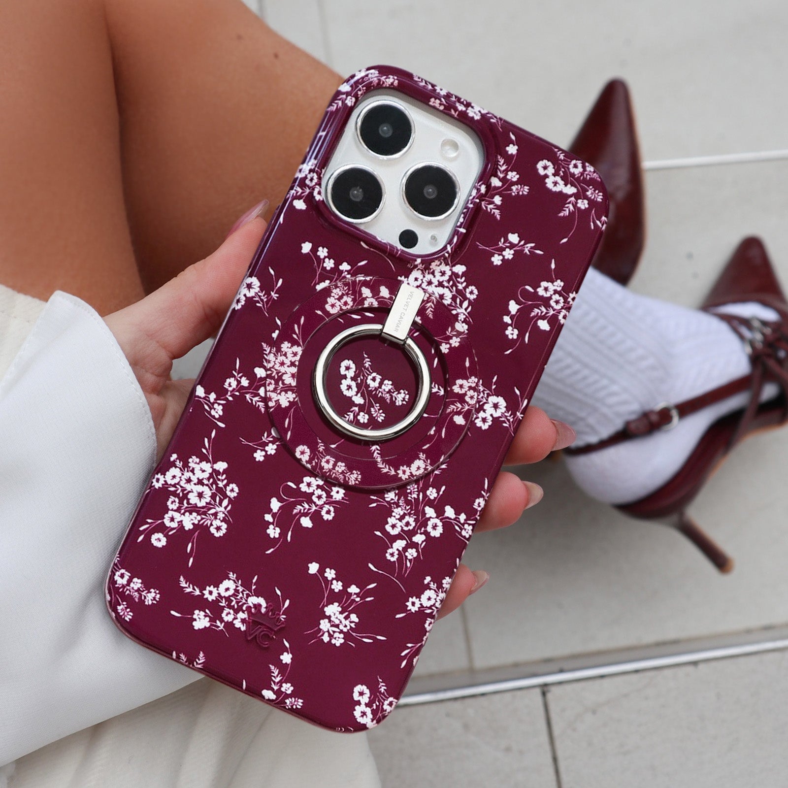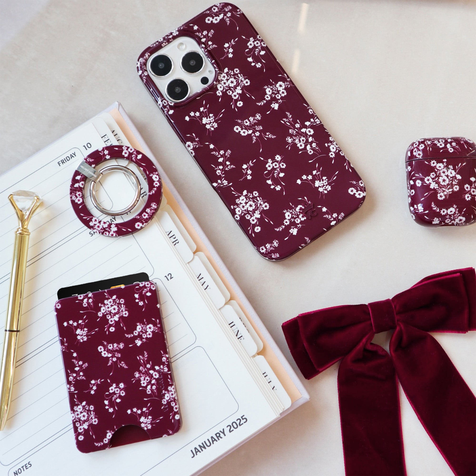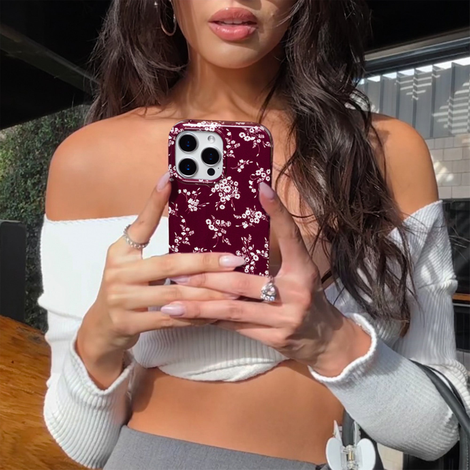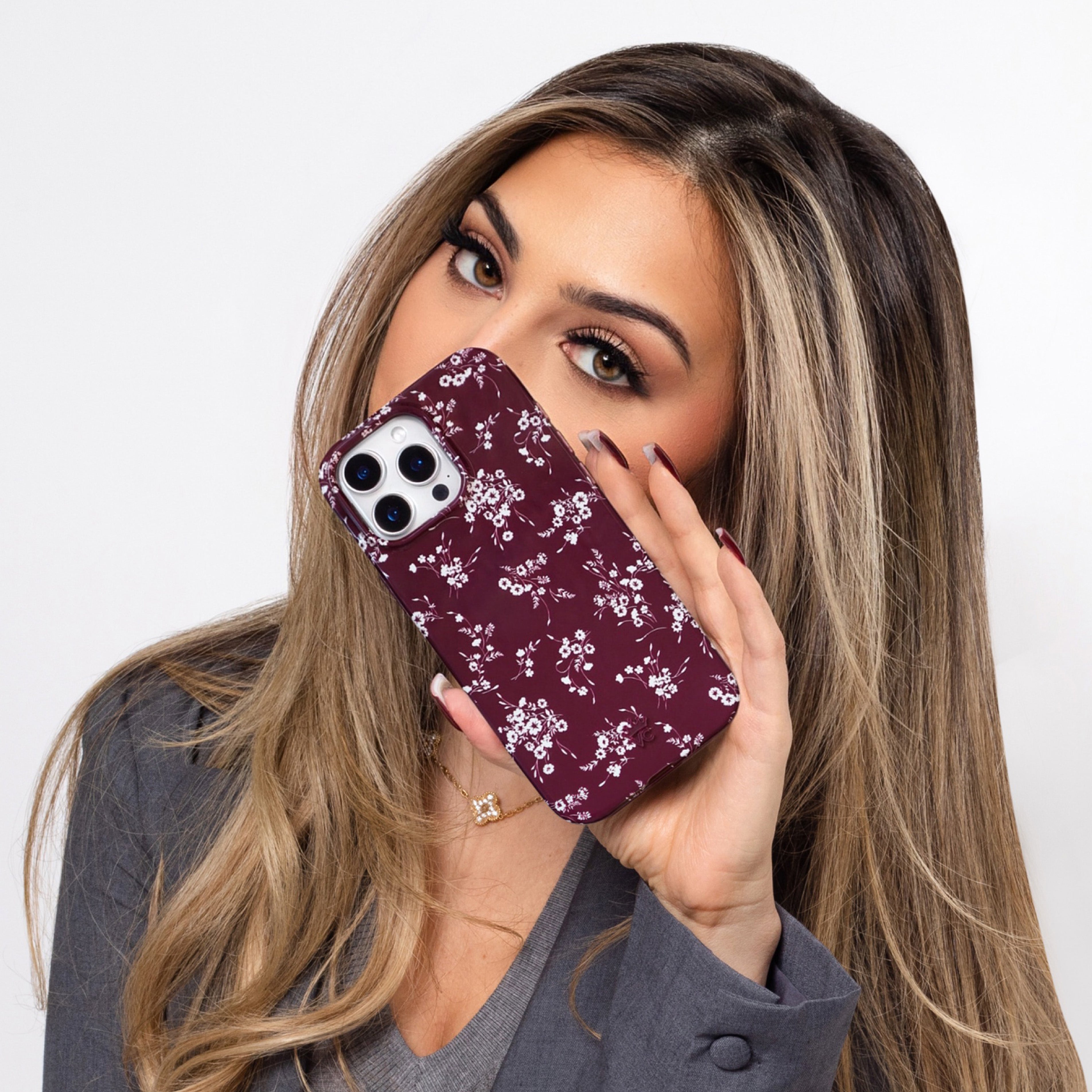 Pretty and Preppy! This MagSafe case features a ditsy off white floral pattern on a glossy burgundy base.