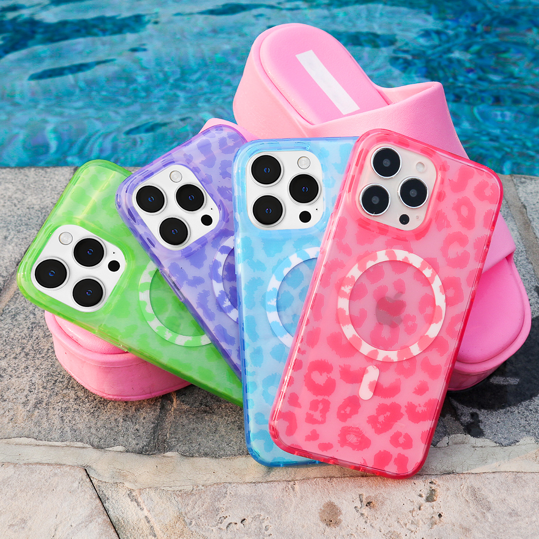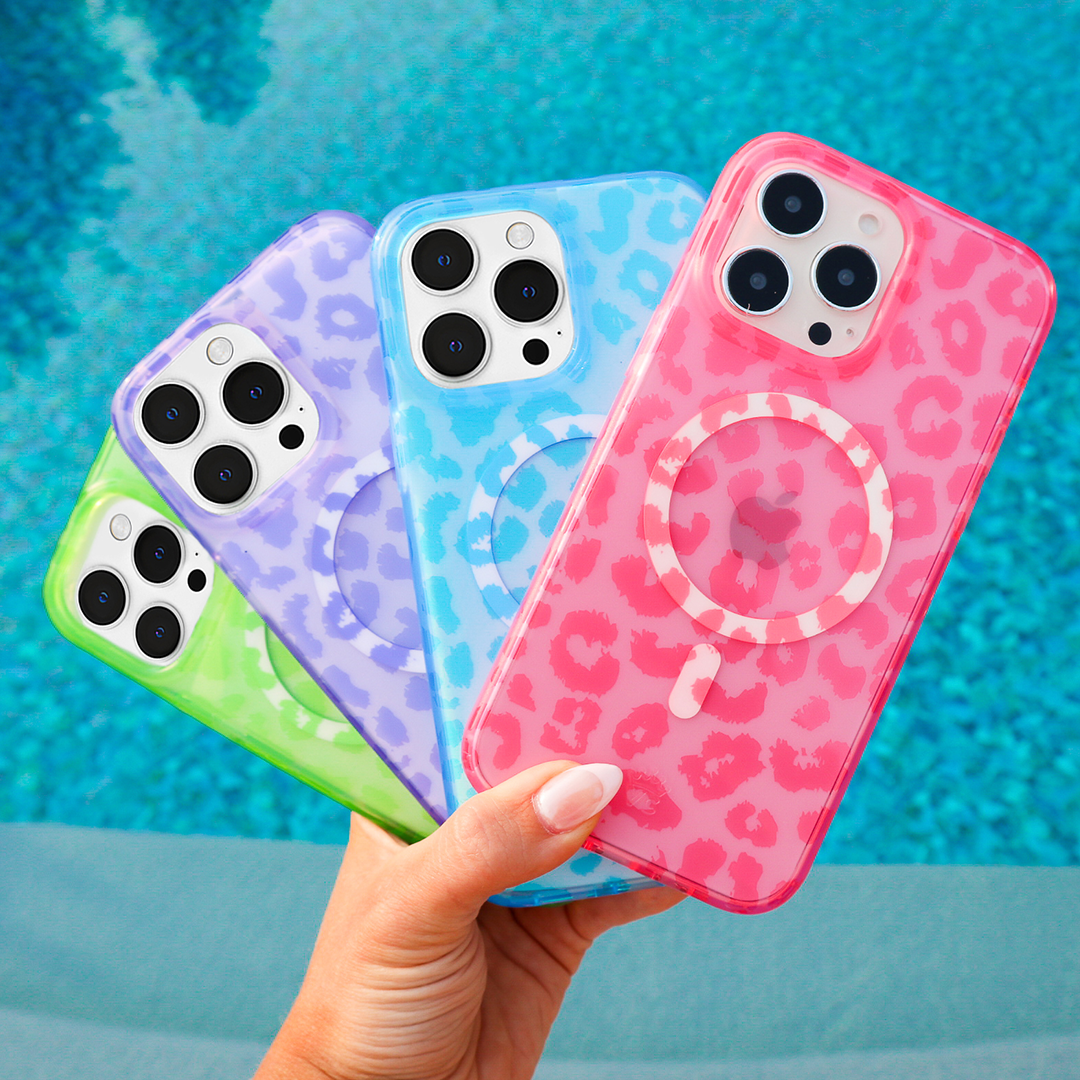 One word. FIERCE! This Limited Edition case features glossy leopard spots on a frosted aqua blue base.