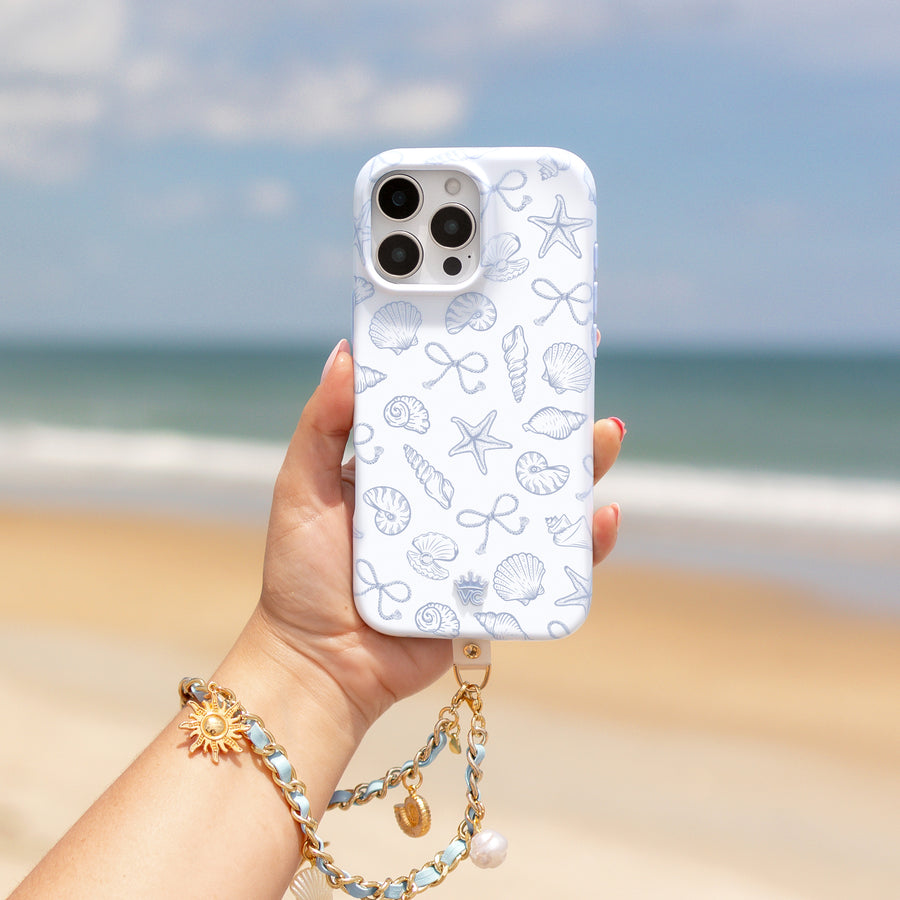 Ocean Air and Coastal Vibes! This MagSafe phone case features nautical blue shells, bows, and starfish all on a glossy off white base.