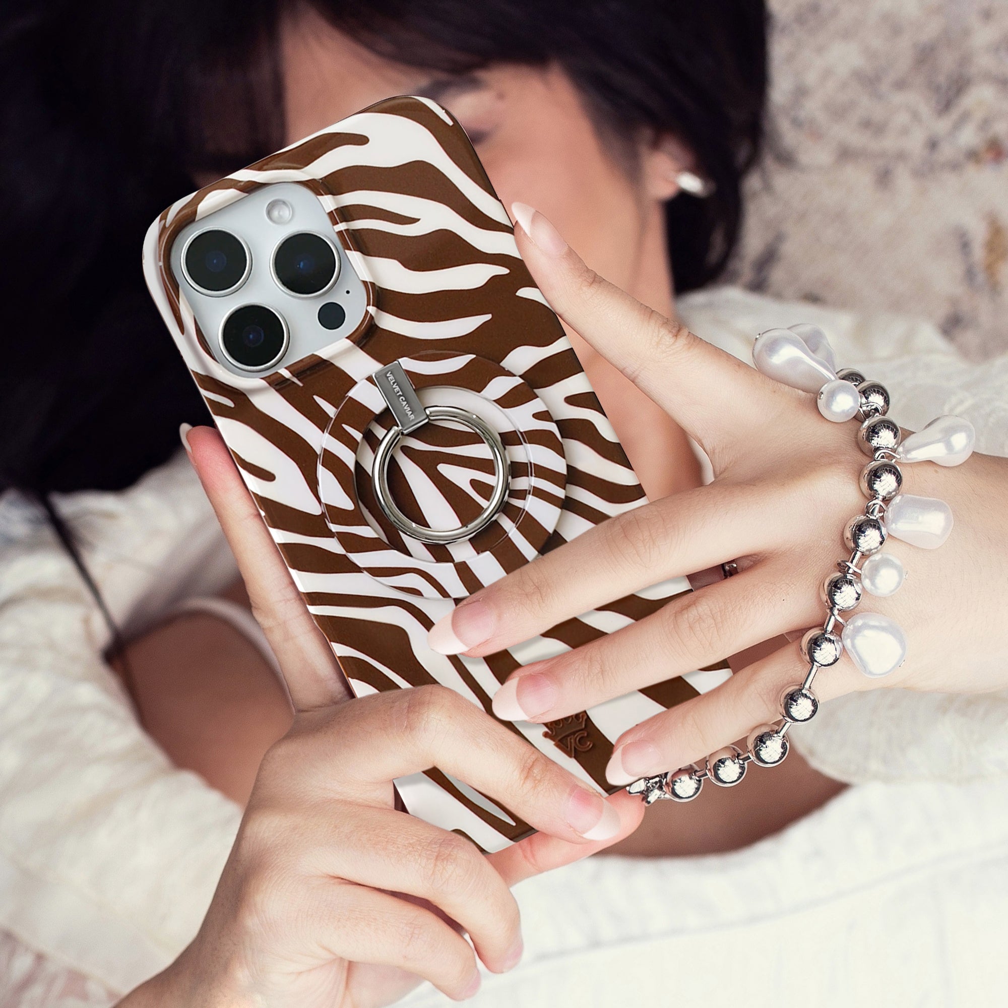 Never change your stripes! This ultra chic MagSafe case features a rich brown and off white glossy zebra pattern with a matching rich brown bumper