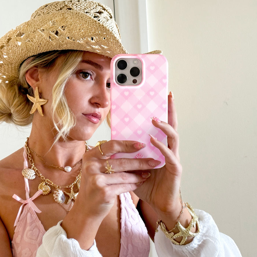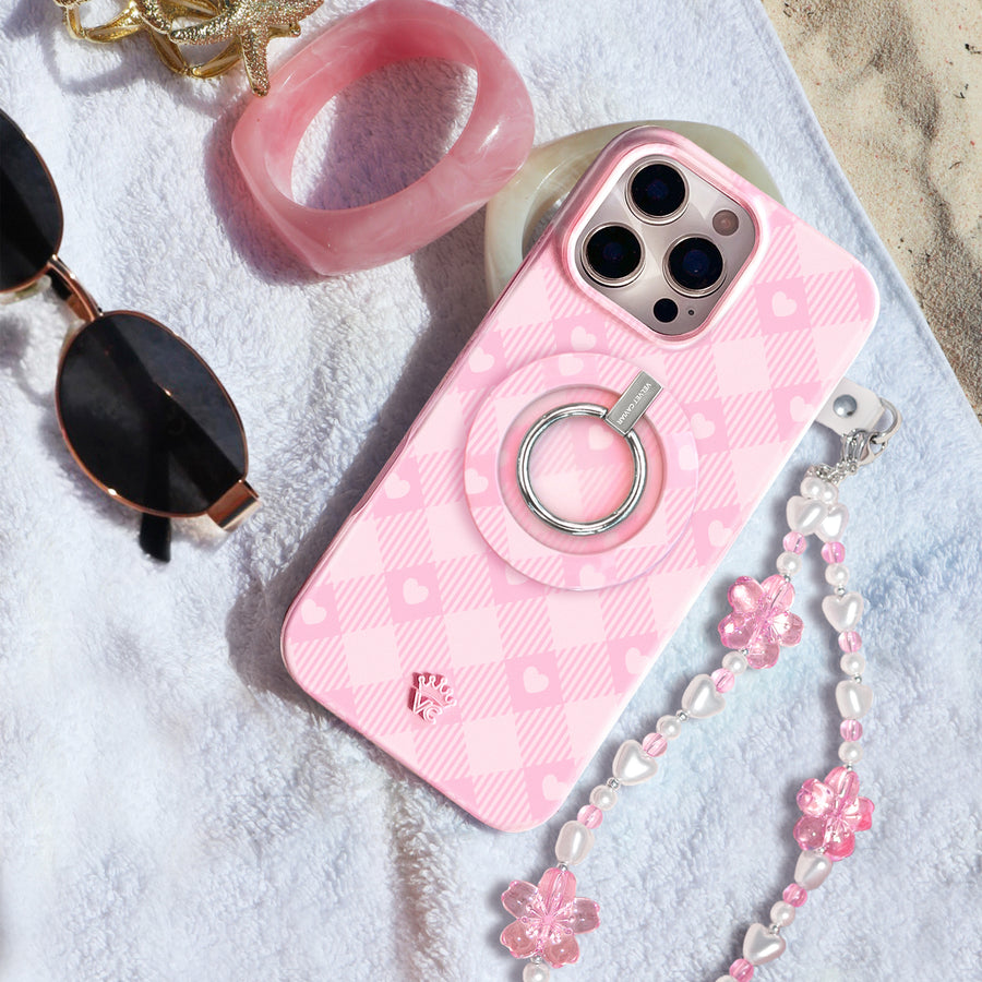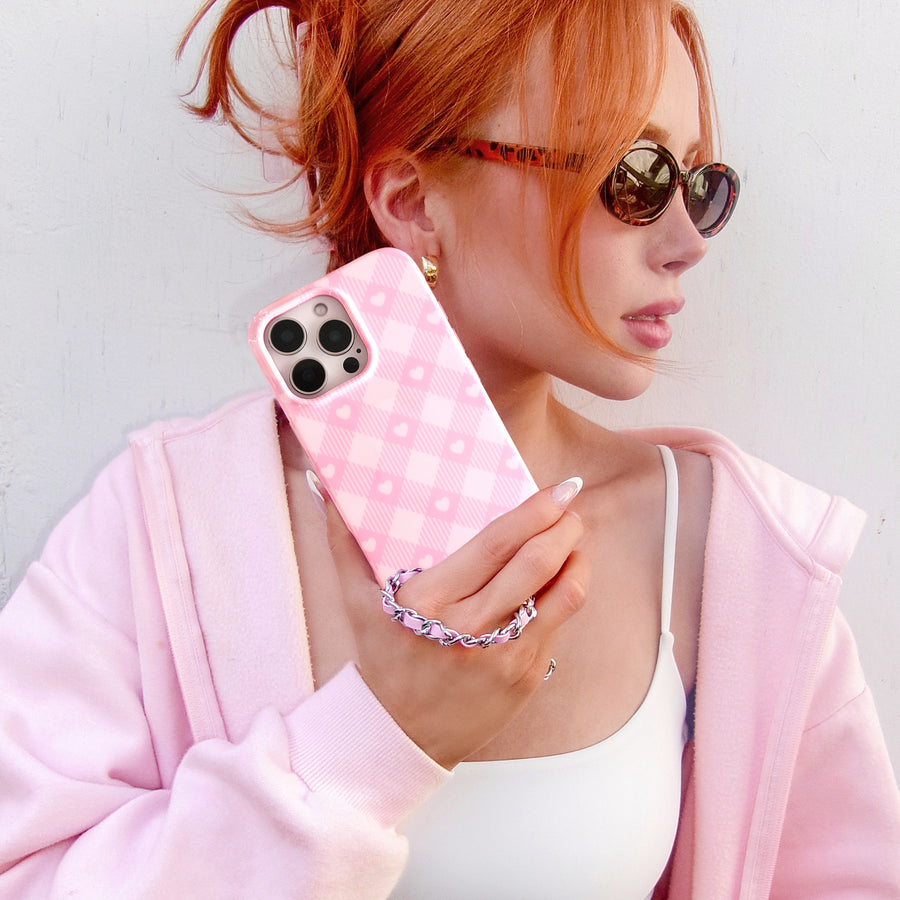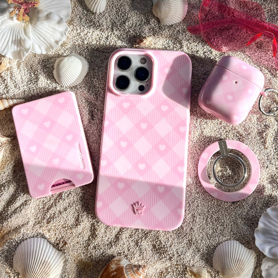 Picnic Pink! This cute MagSafe phone case features a classic cool toned pink gingham print and baby pink hearts with a matching base and bumper.