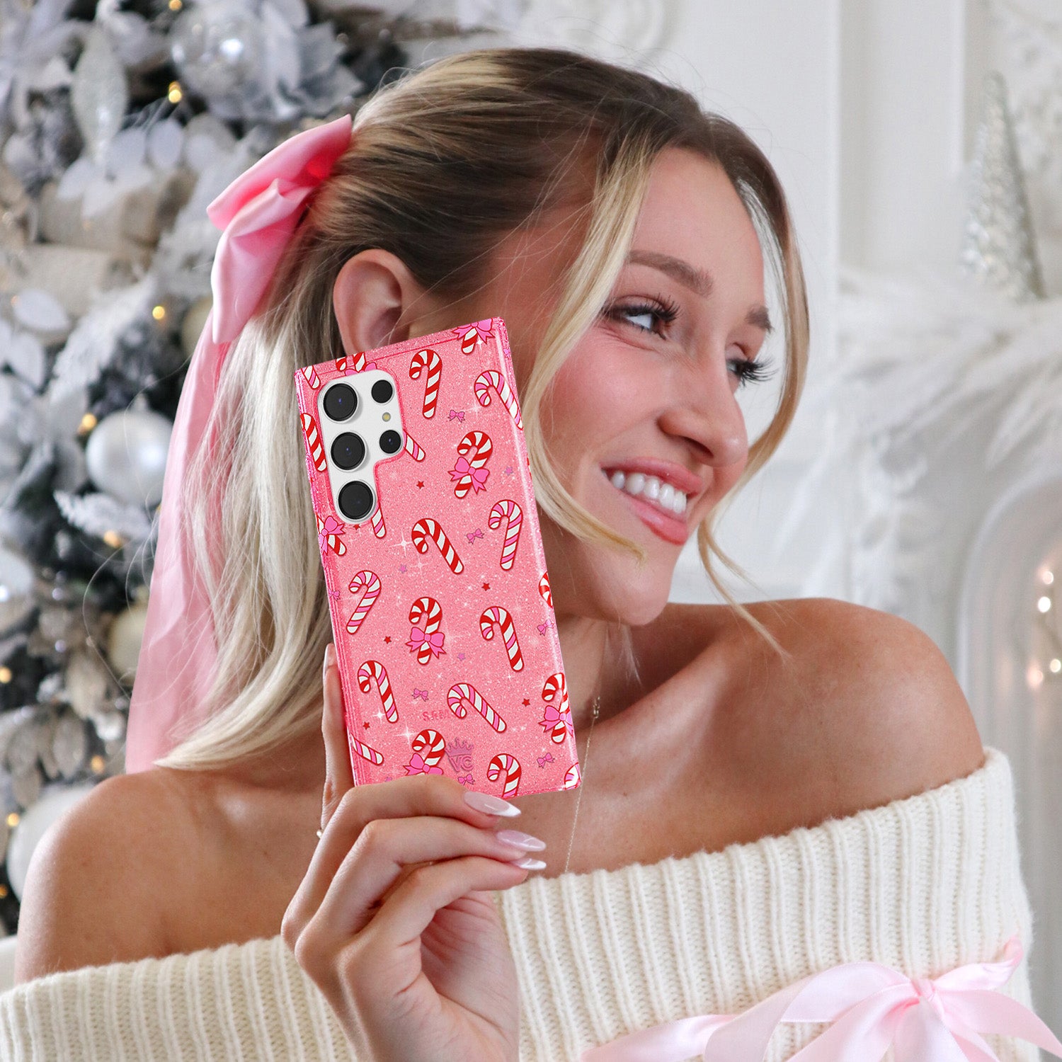 Happy Holidays! This protective transparent pink case has silver glitter sprinkled into the base and bumper and is covered in adorable peppermint candy canes and pink bows.This case is part of our Limited Edition Christmasand Hanukkah Collection.