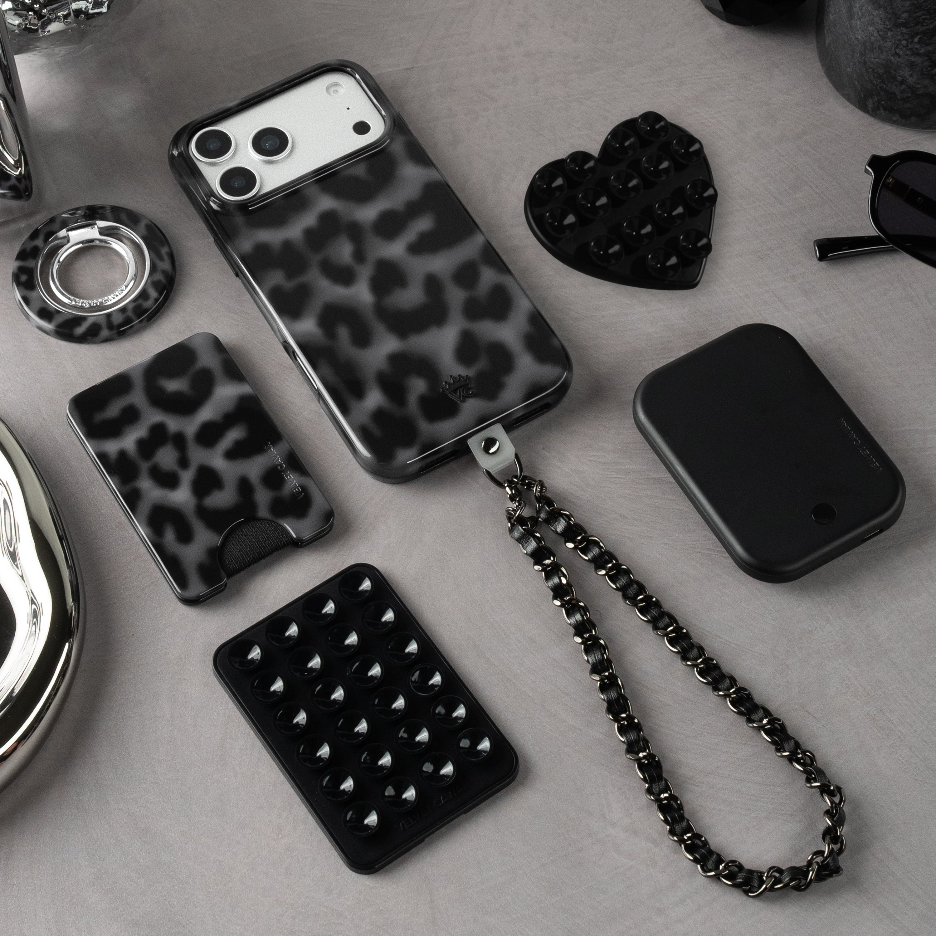 Instant It Girl! Turn heads in this glossy MagSafe case featuring black leopard spots on a dimensional cool grey base.