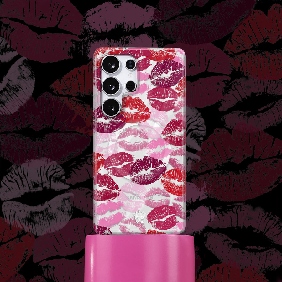 What if we kissed? This chic protective case features red, pink, and purple lipstick kisses on a clear case.