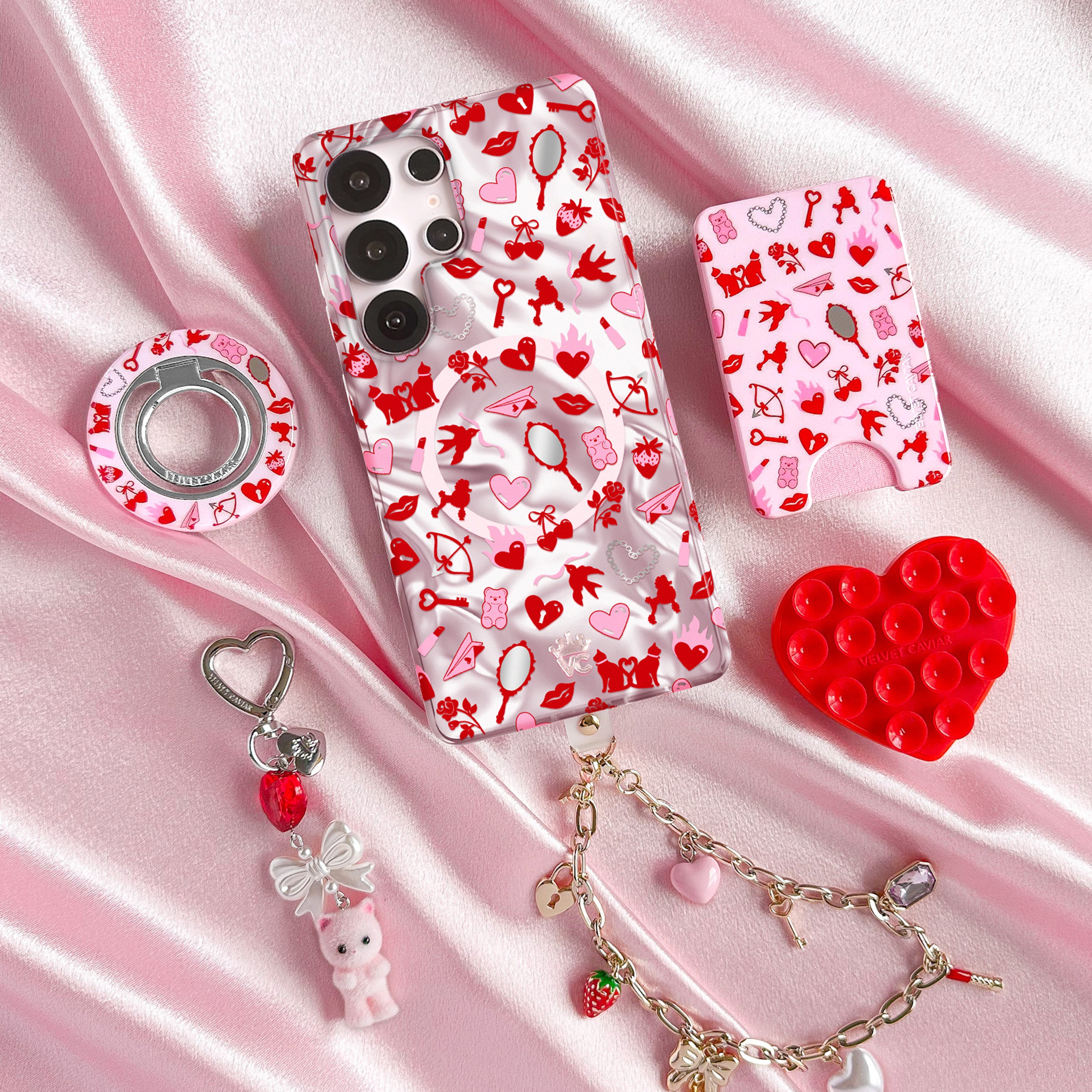 Fall in love! This stunning protective phone case features red and pink hearts, kisses, Valentine's motifs, and chrome mirrors on a pinky silver base with a holographic wave effect throughout.