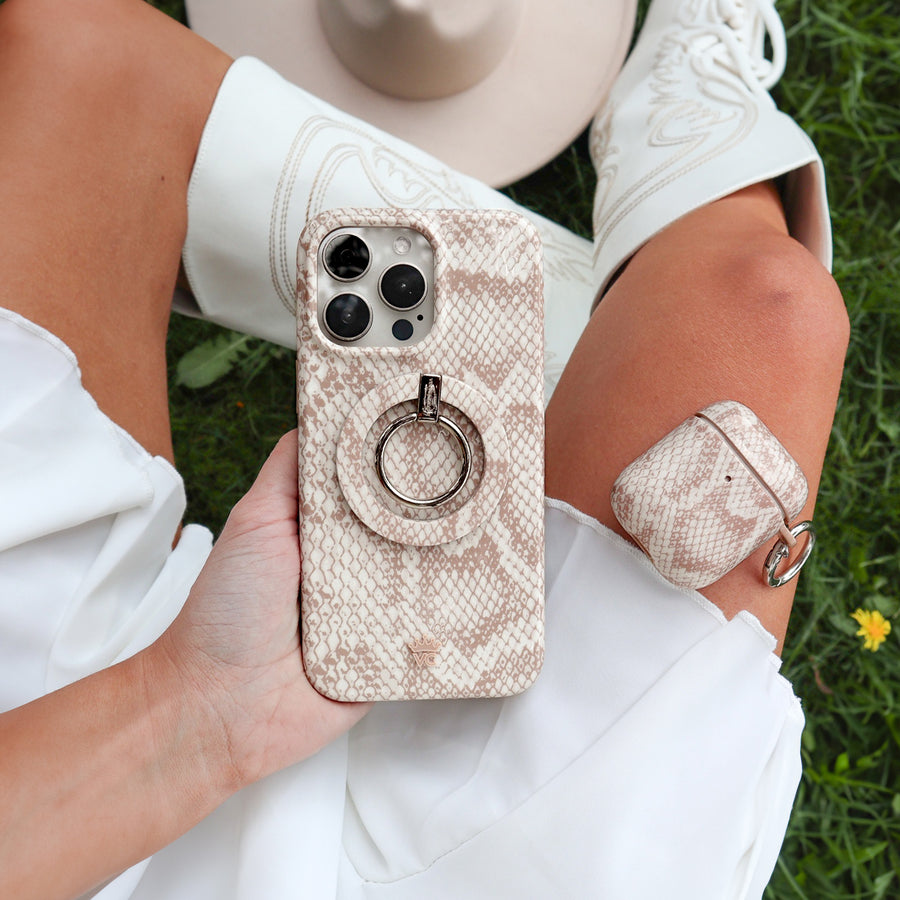 An ode to our exes! This western rodeo MagSafe case features a neutral python pattern with a matte cream base and glossy nude reflect.
