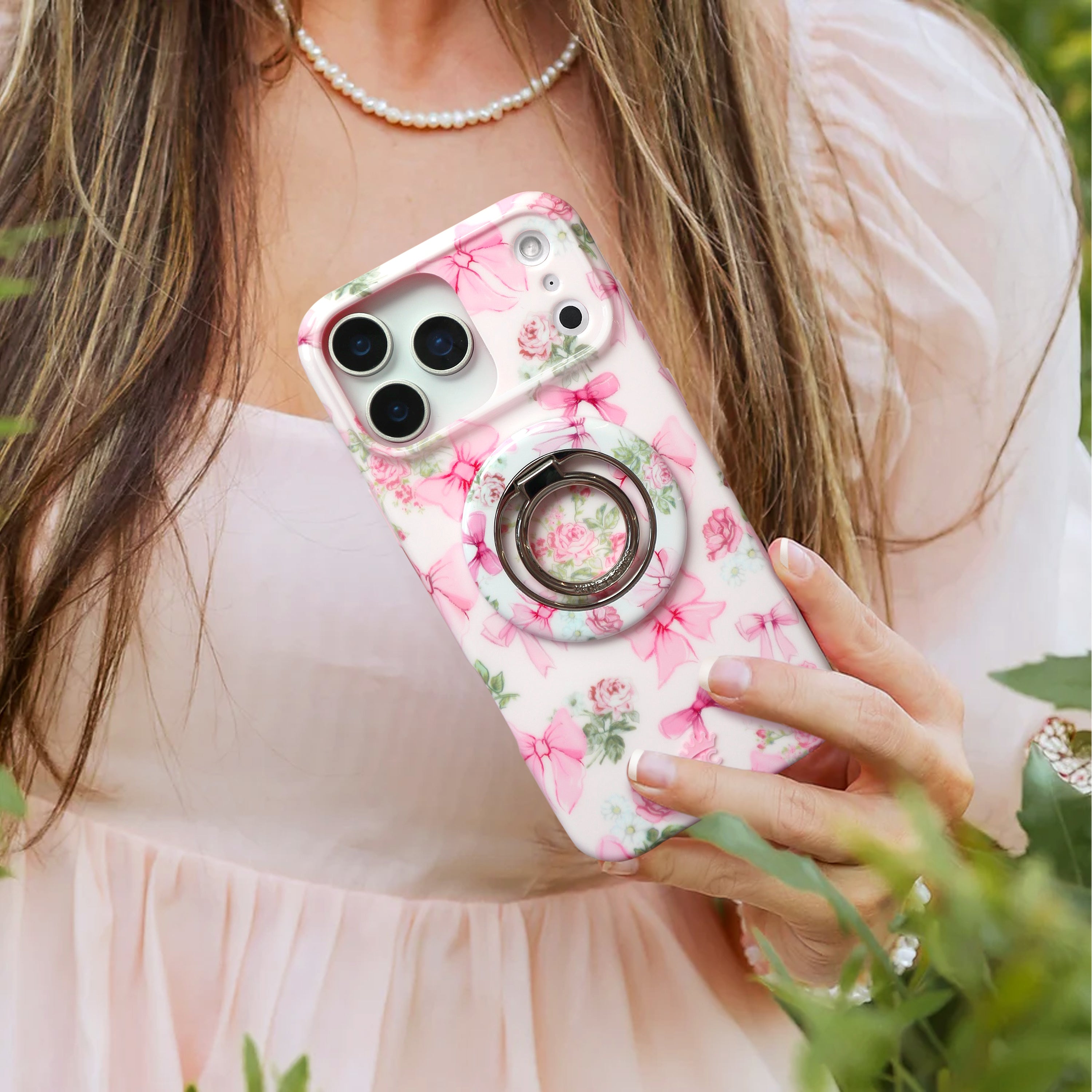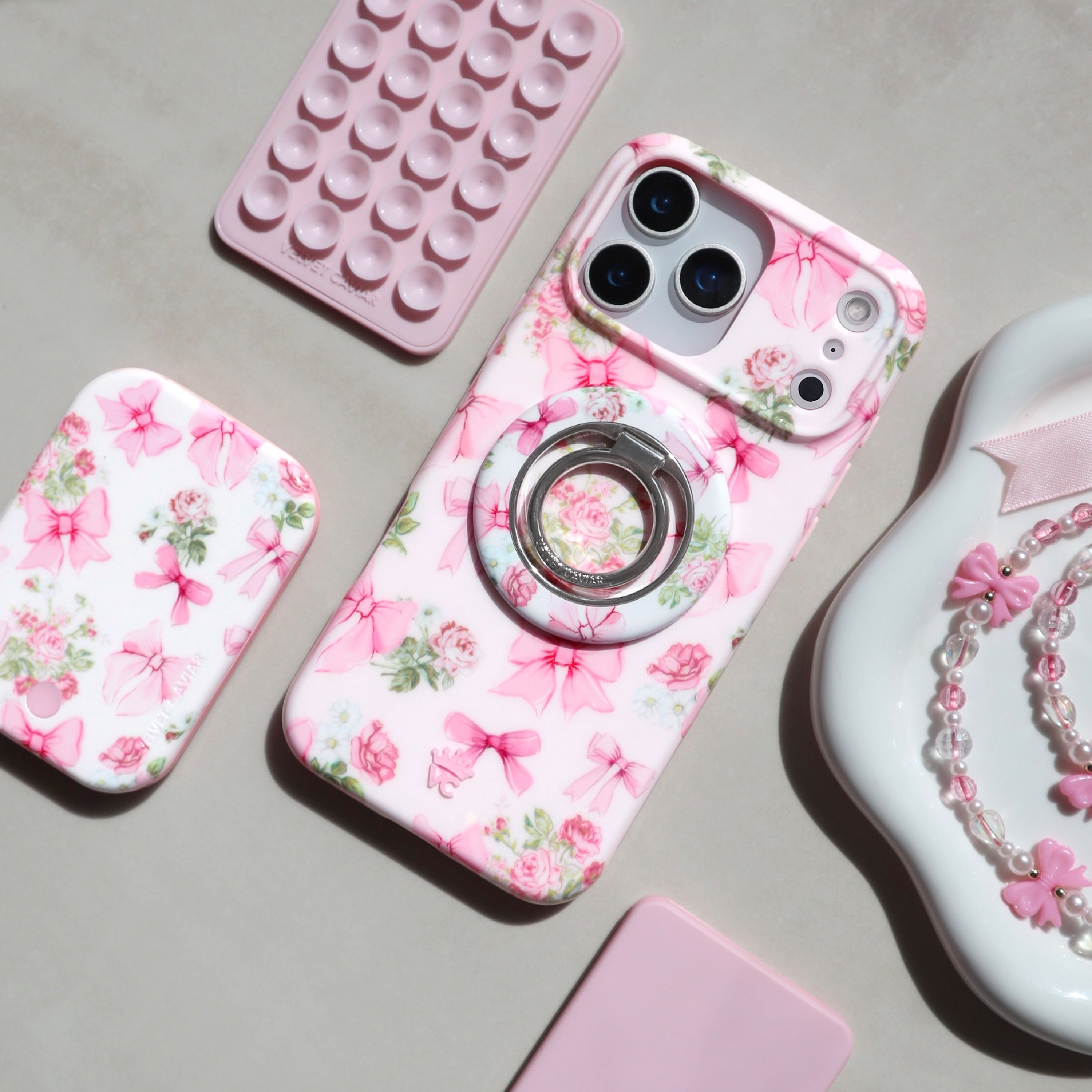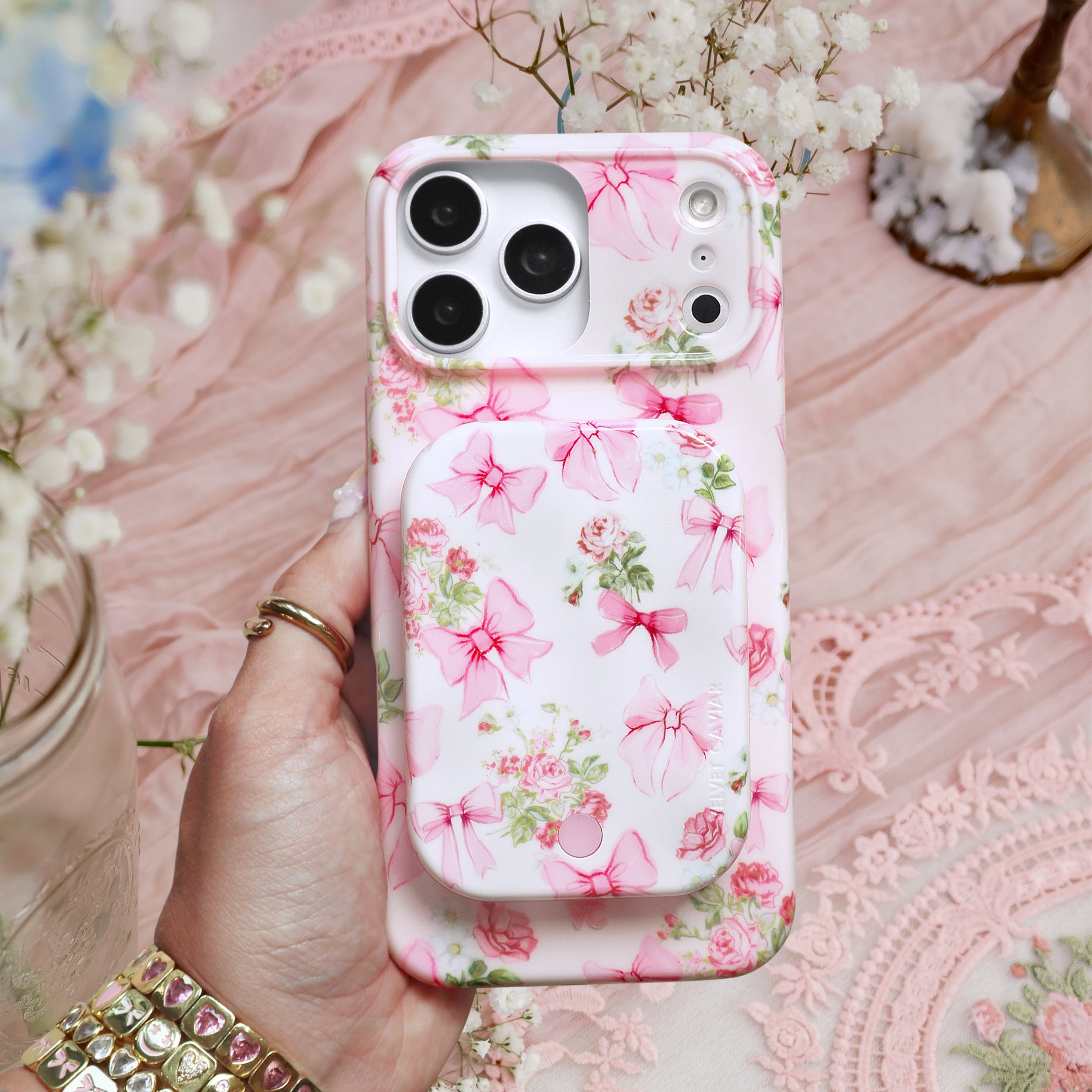 Coquette Core! This protective case features an array of romantic hand drawn bows and bouquets on a glossy pale pink base.