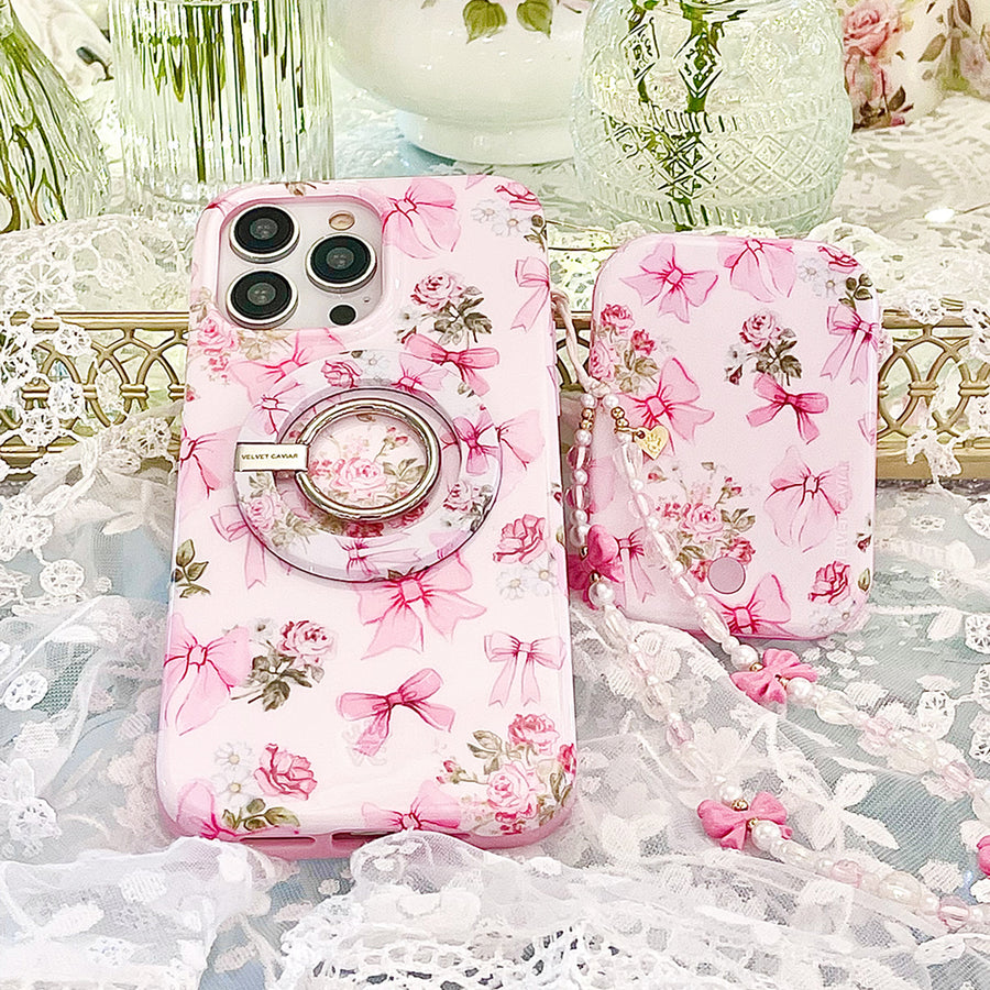 Coquette Core! This protective case features an array of romantic hand drawn bows and bouquets on a glossy pale pink base.