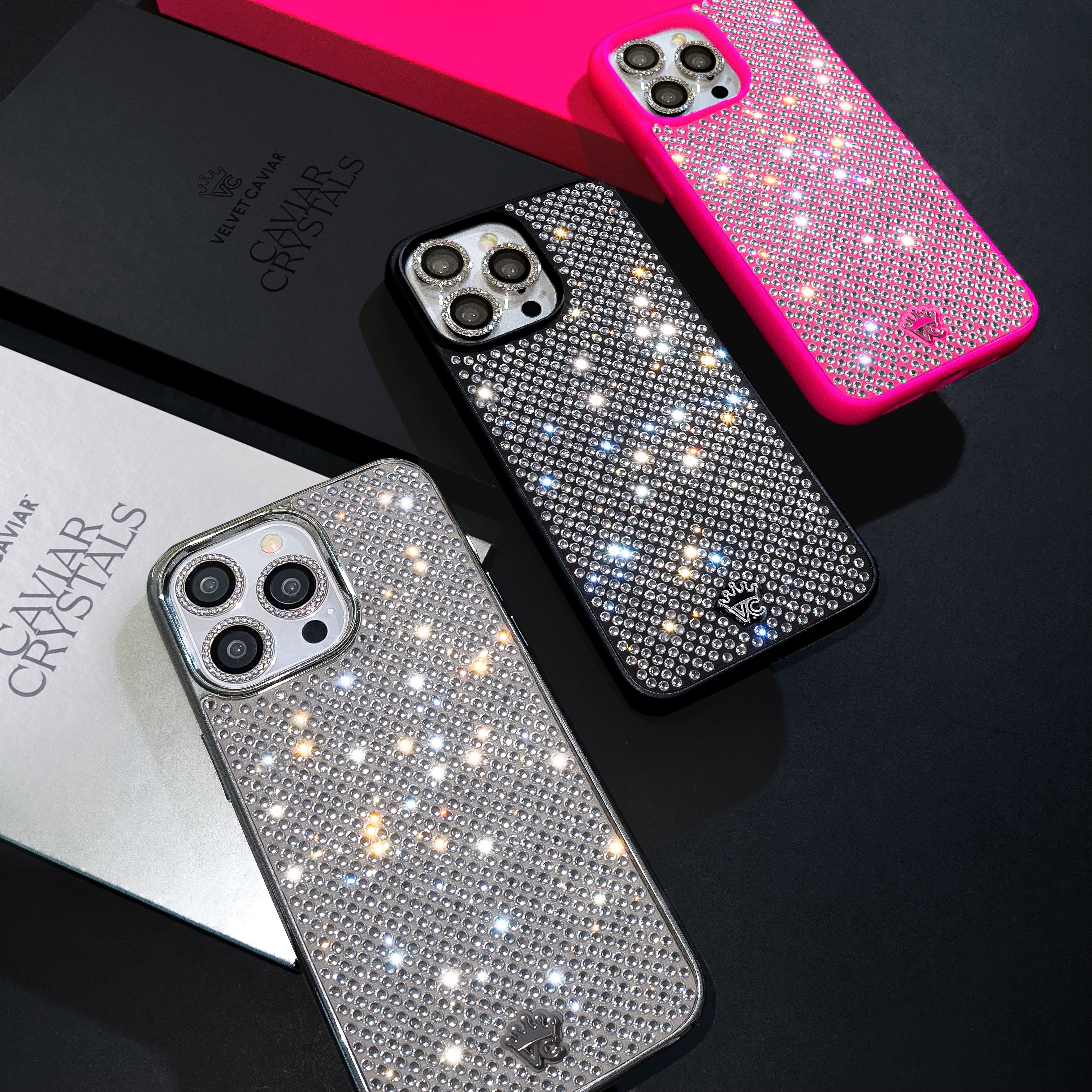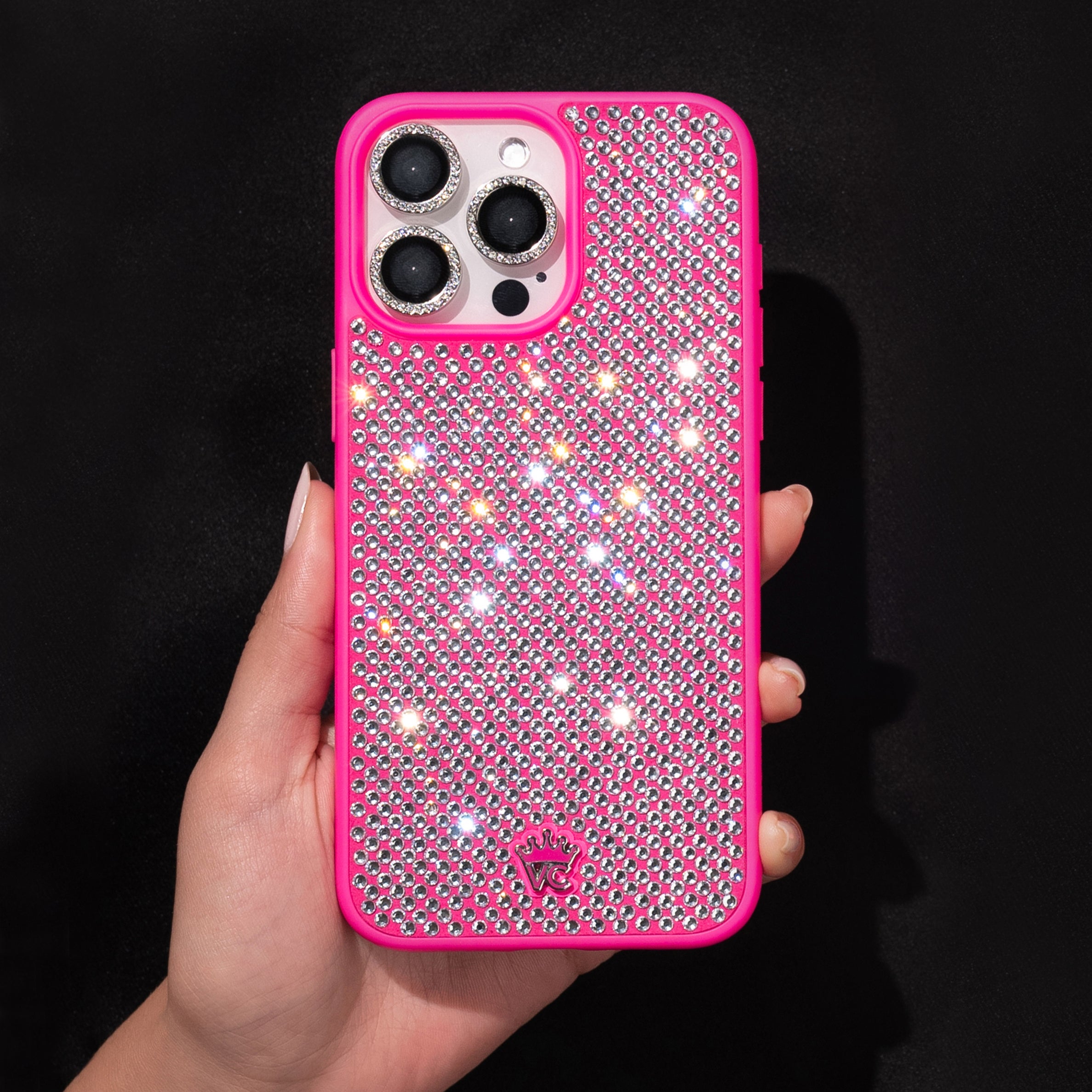 The most dazzling crystal case ever made! Covered in 600+ hand-placed glass crystals that sparkle like no other. Protected in an 8' drop tested matte hot pink case. This case is not compatible with MagSafe or wireless charging.
