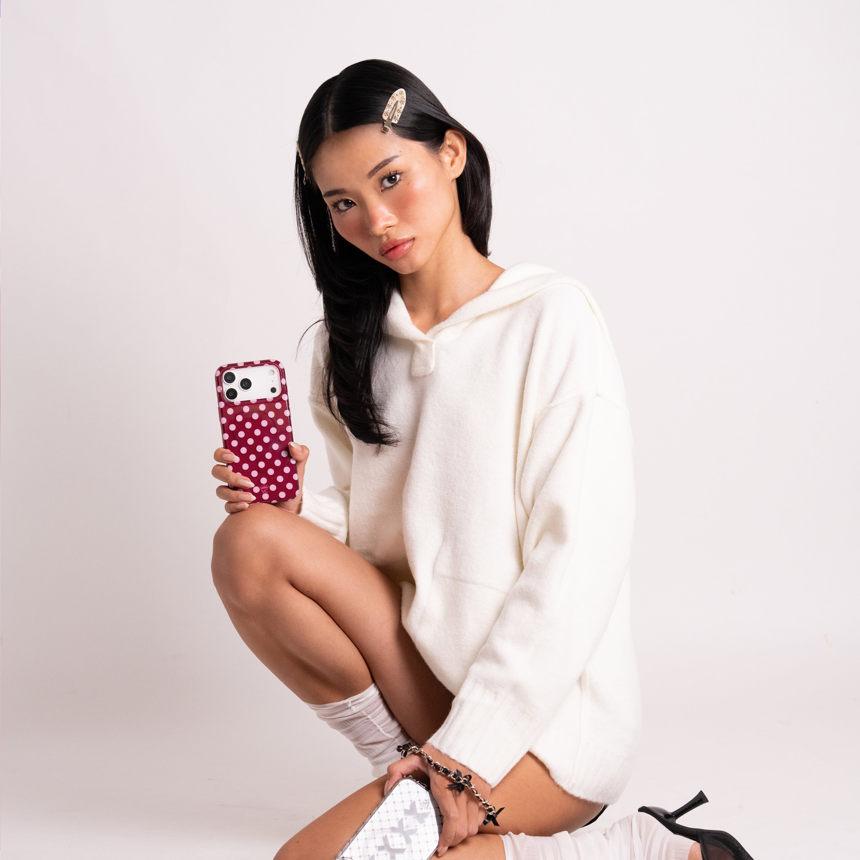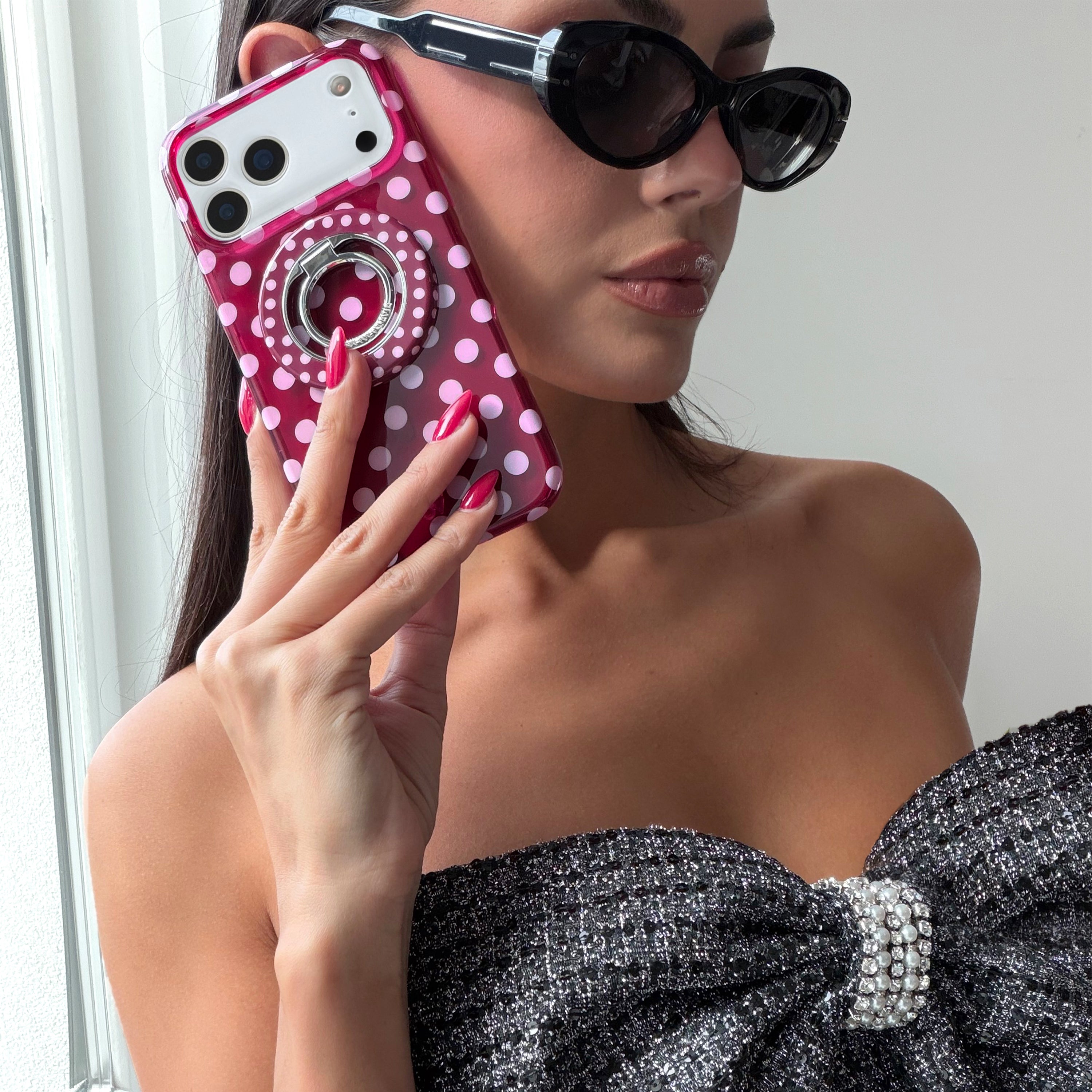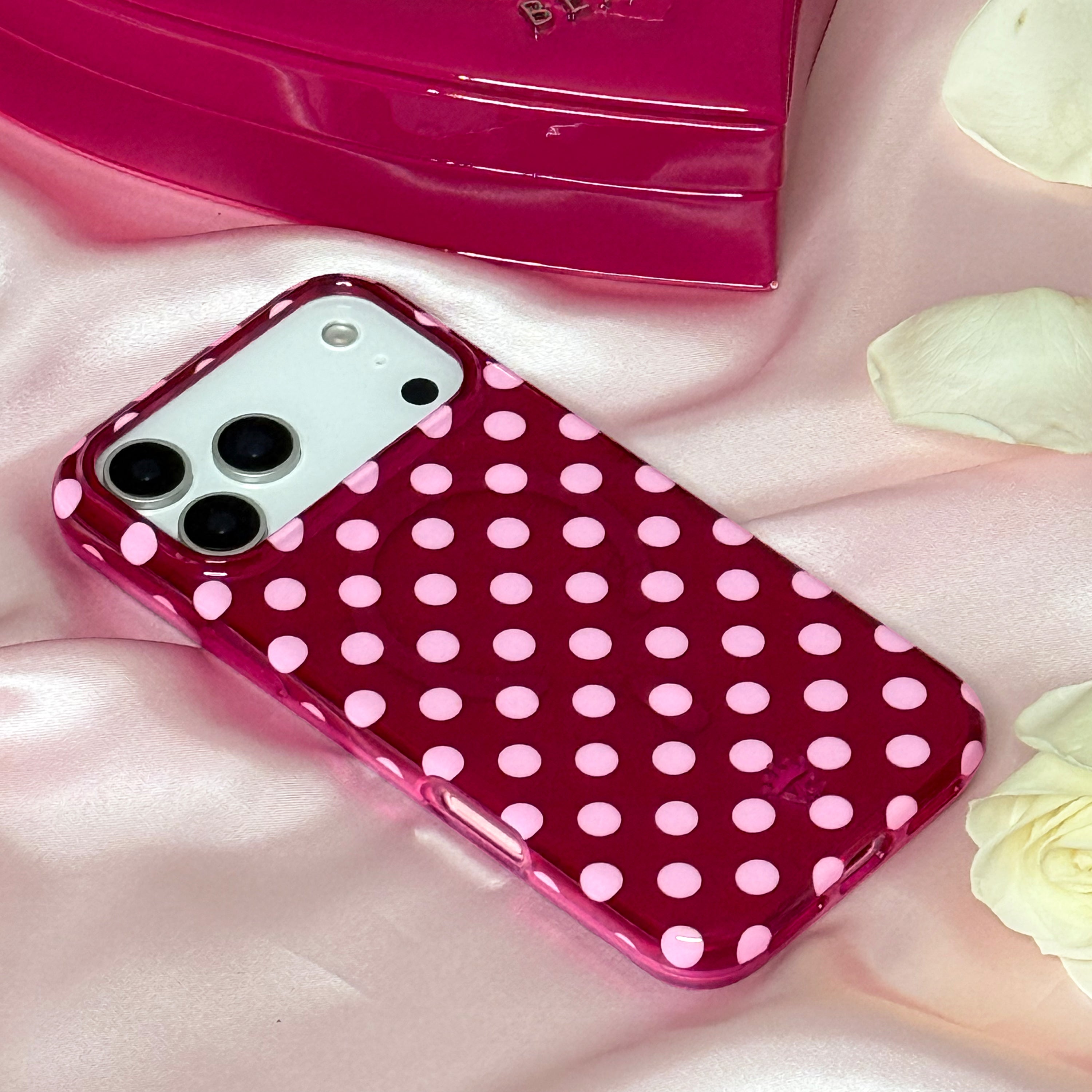 Playful and posh! This simple MagSafe case features trending light pink polka dots on a jammy raspberry base.