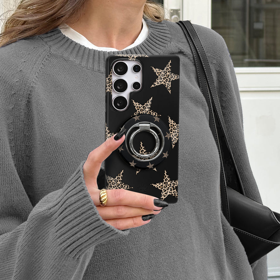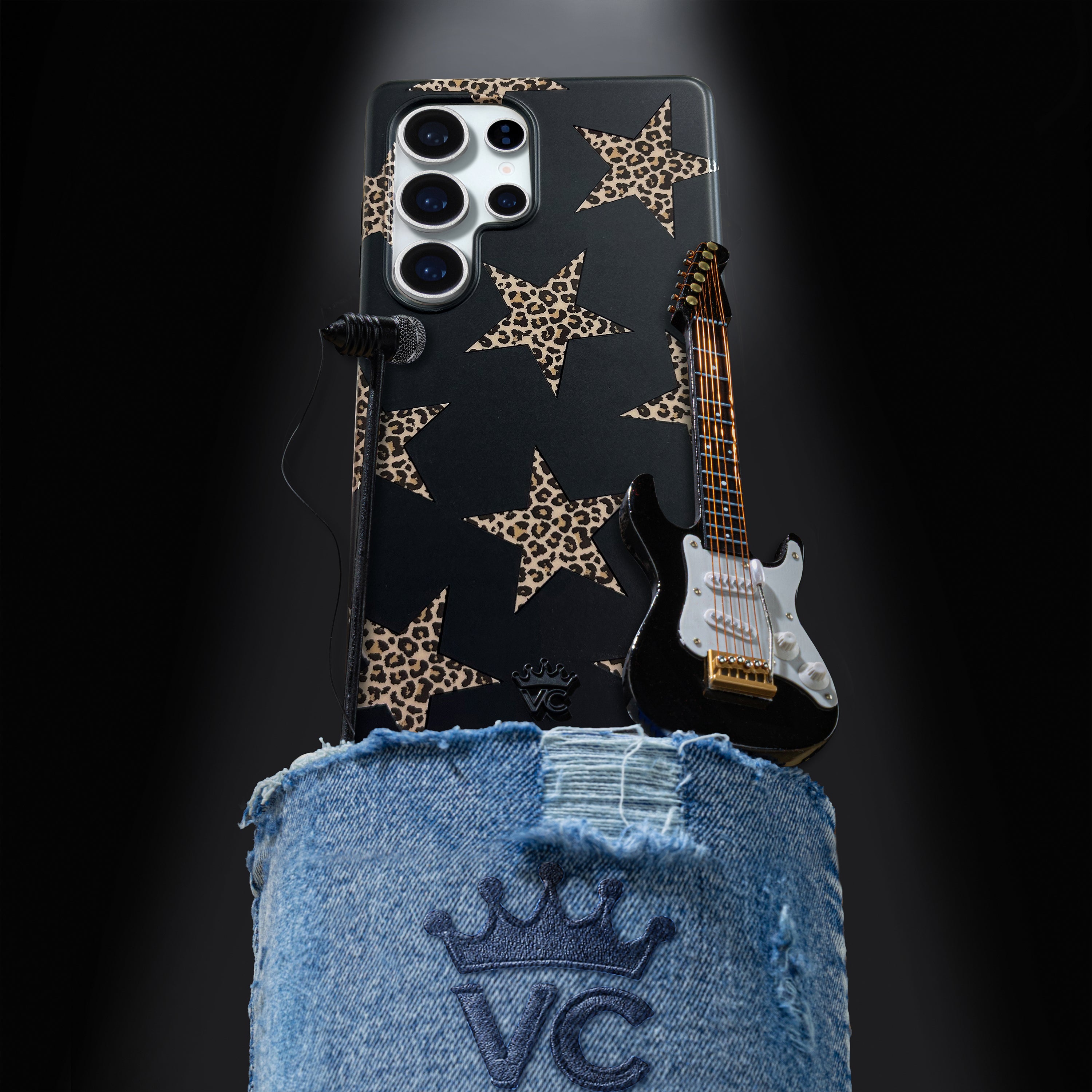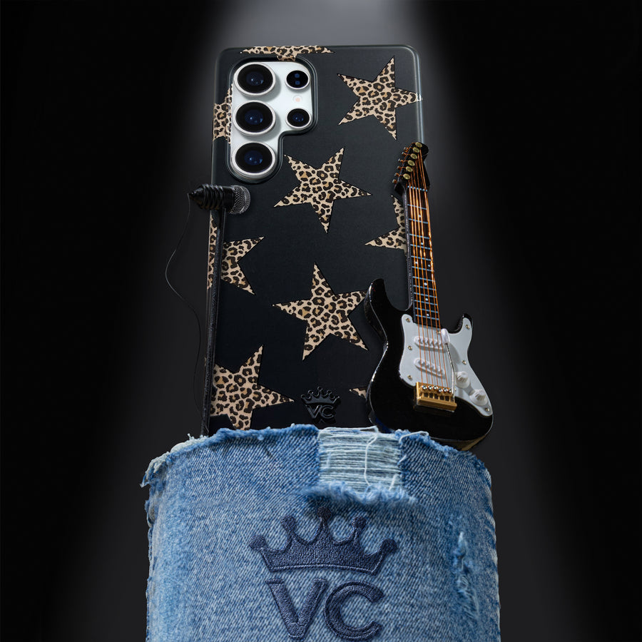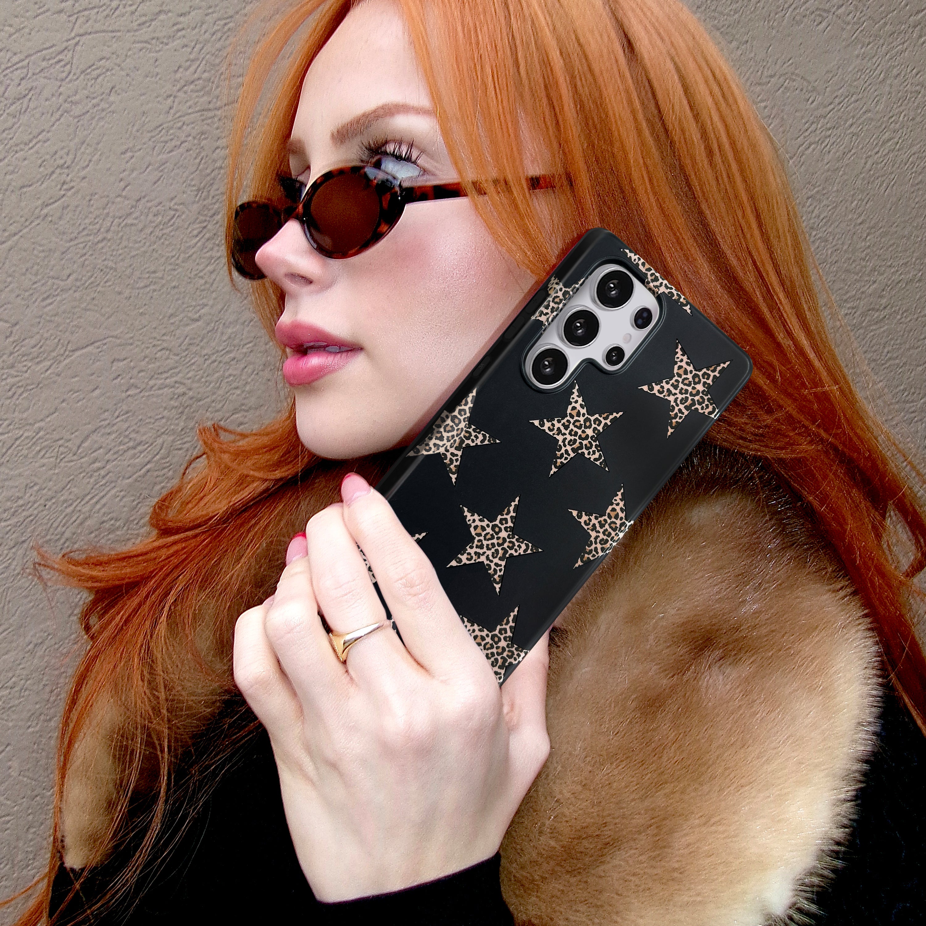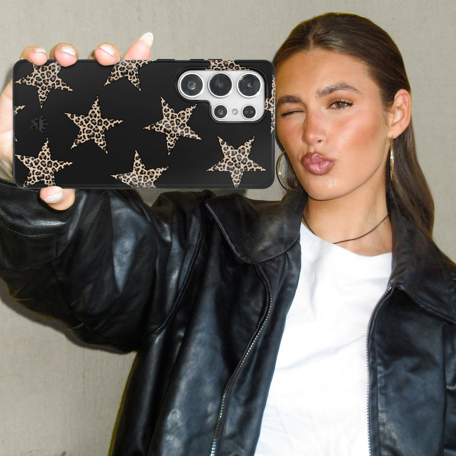 Add a little edge! This protective case features leopard print stars on a matte black base.