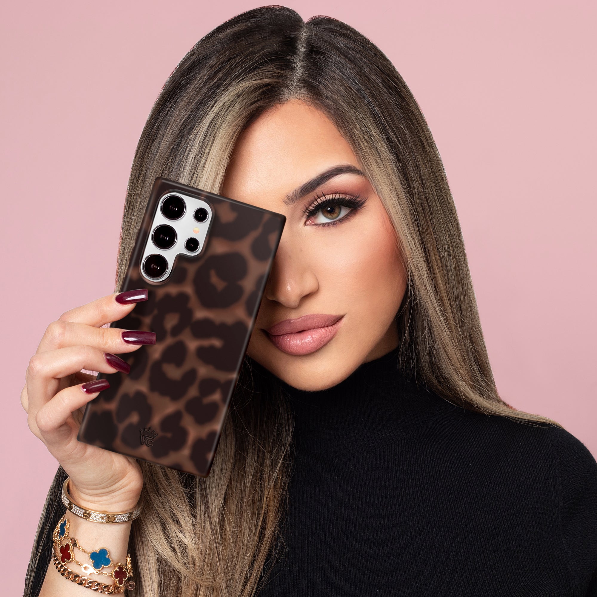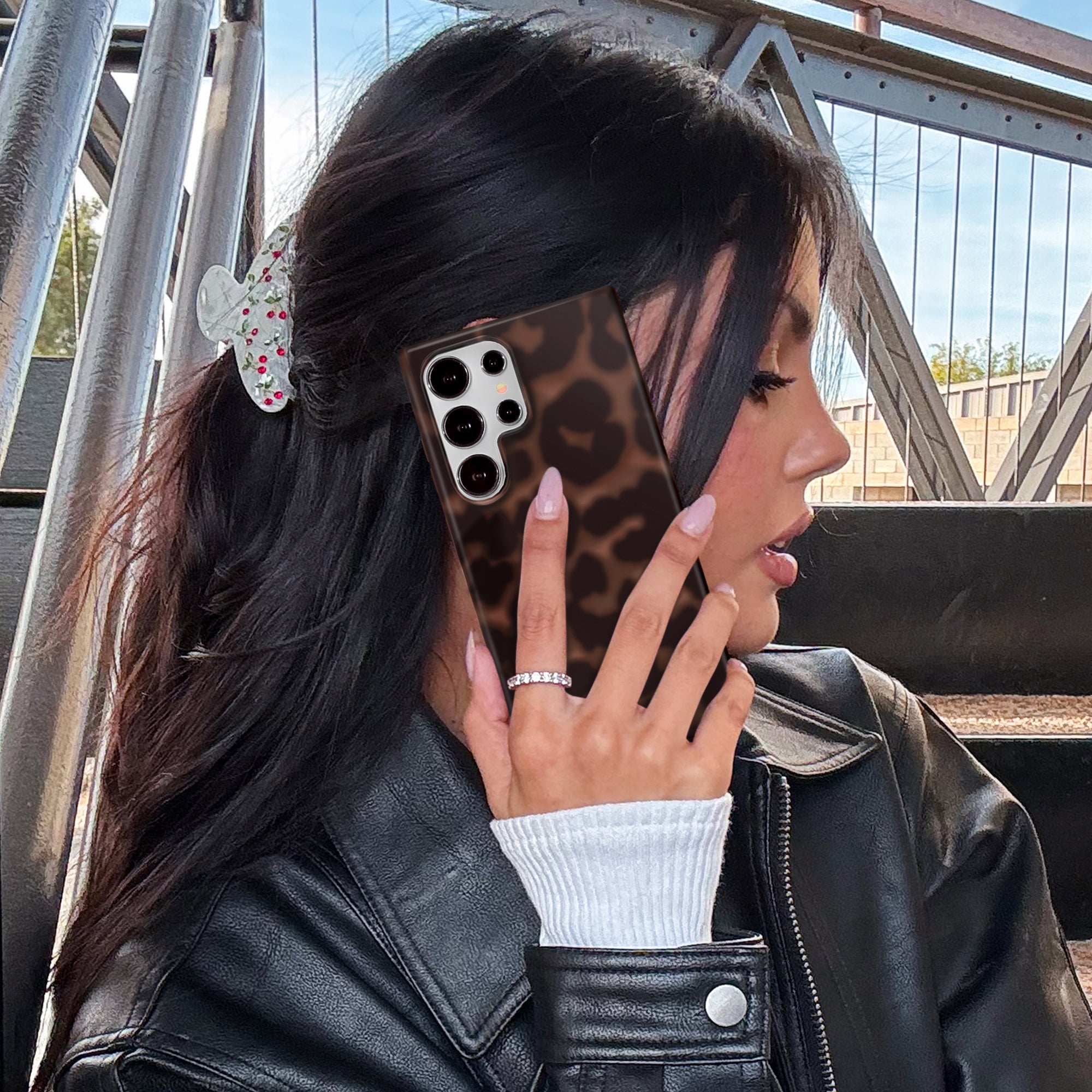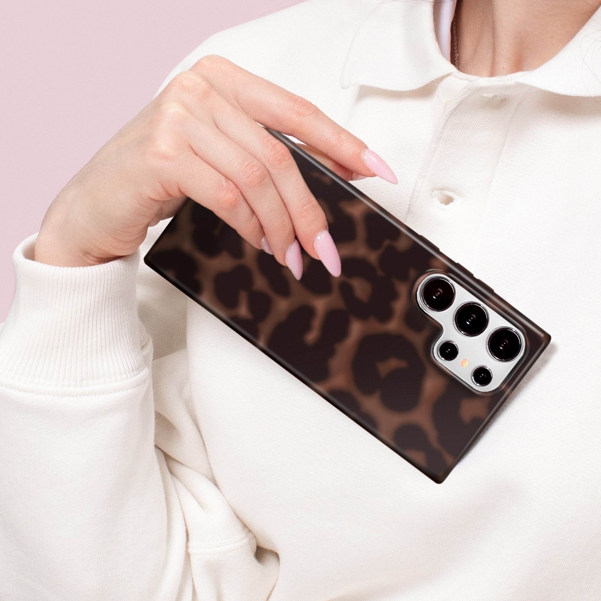 Instant It Girl! Turn headsin this glossy protective case featuring deep brown leopard spots on a dimensional chocolate brown base.