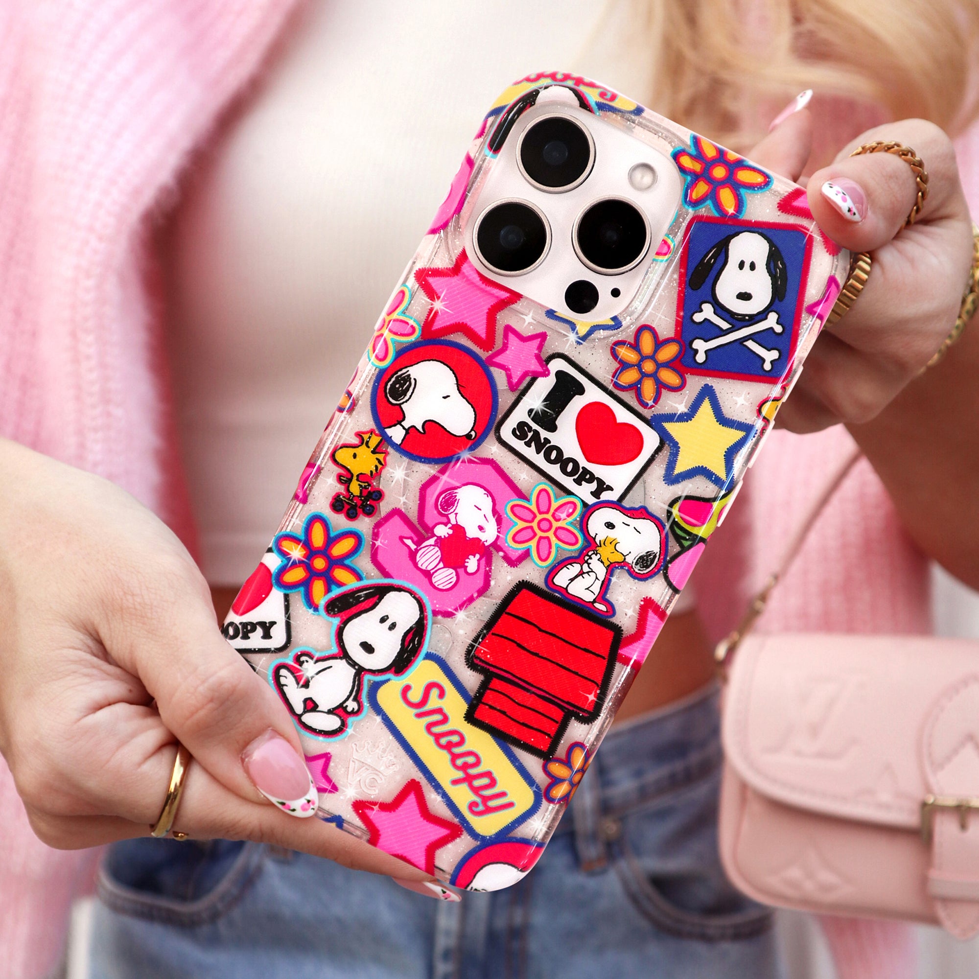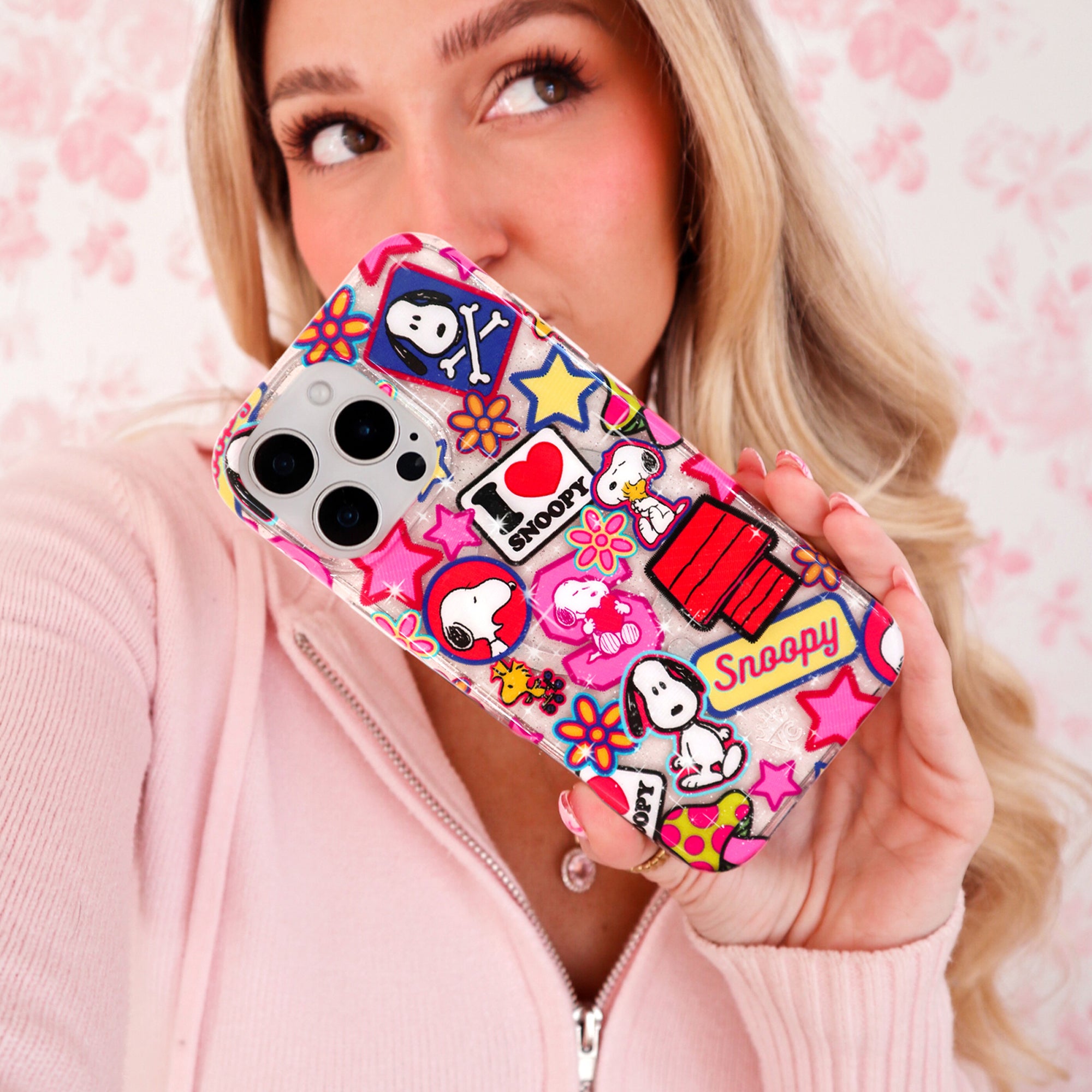 This MagSafe case features Snoopy all over in a patchwork inspired design on a clear case with silver glitter sprinkled into the base and bumper. In collaboration with Peanuts™