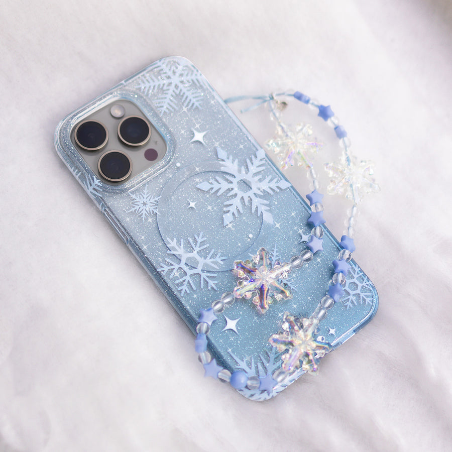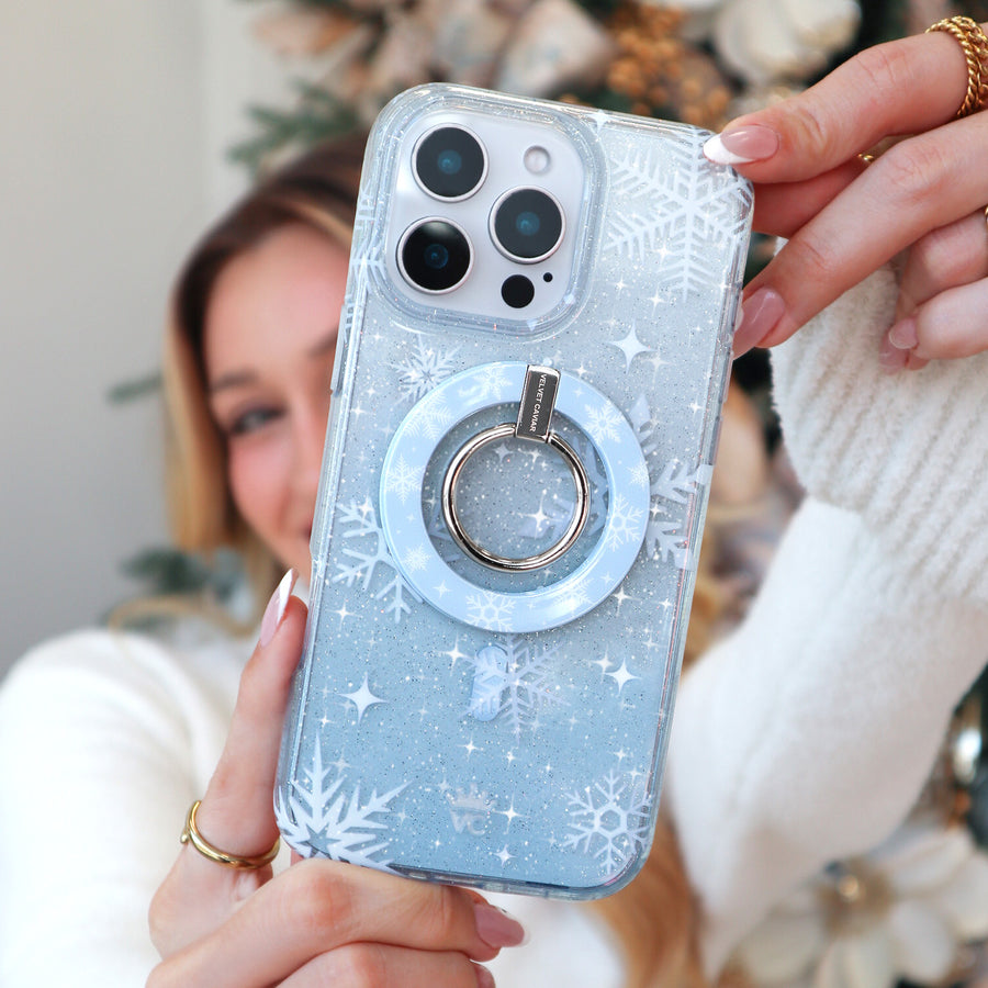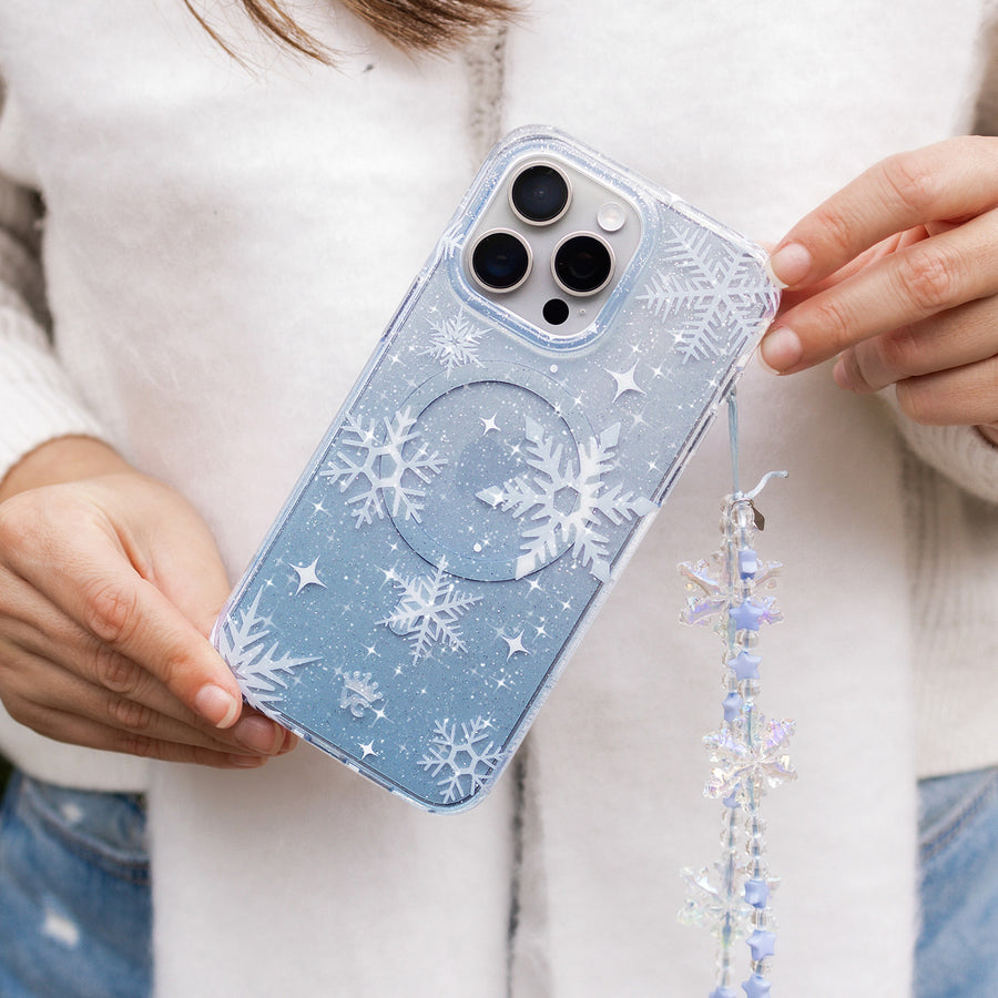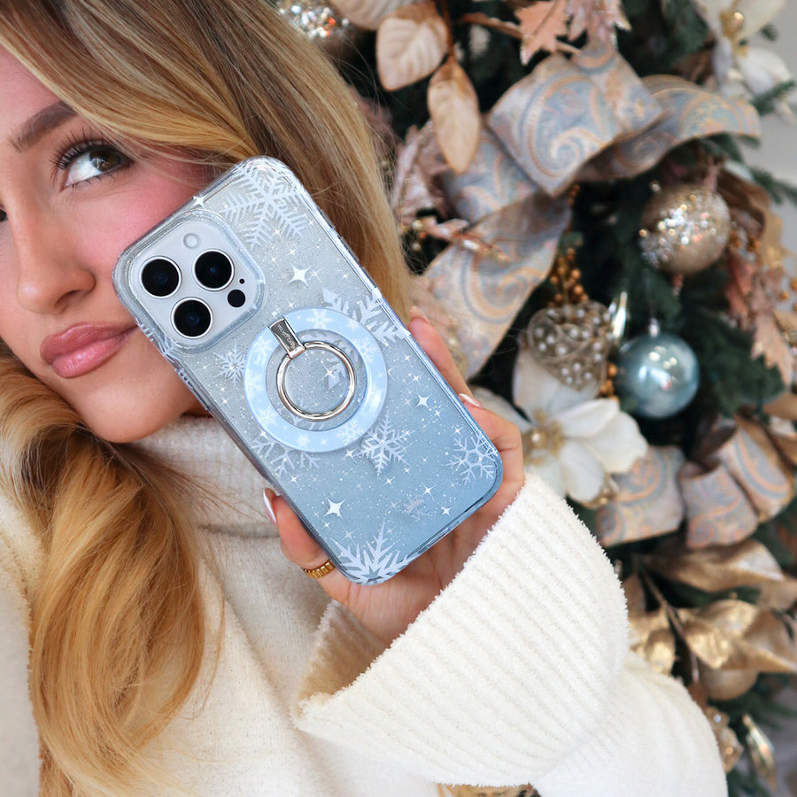 Happy Holidays! This MagSafe case features unique white snowflakes on a transparent icy blue case with silver glitter sprinkled into the base and bumper. This case is part of our Limited Edition Christmasand Hanukkah Collection.