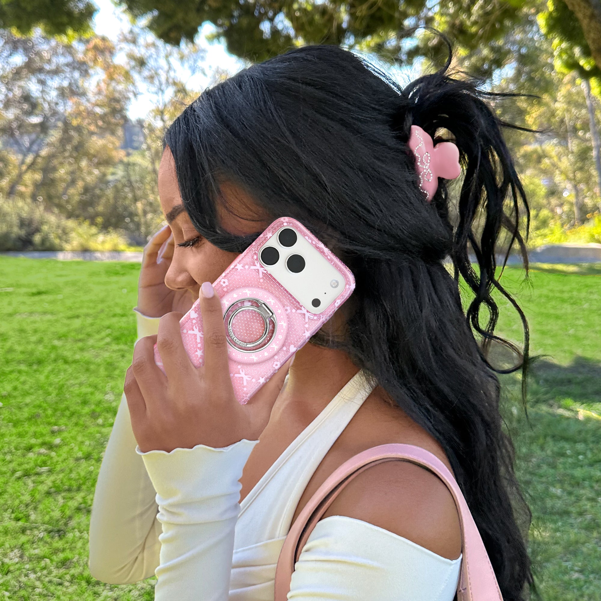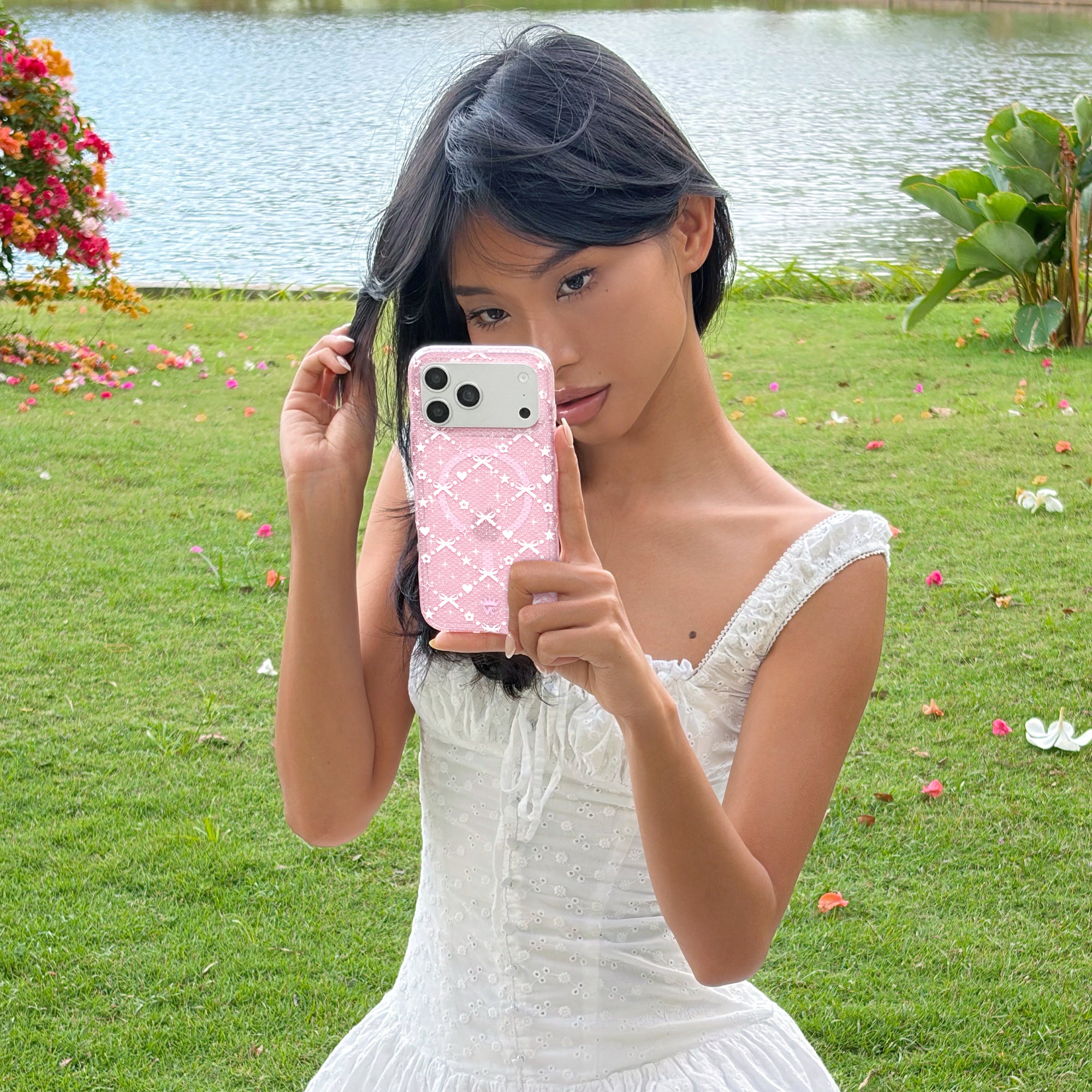 Sweet as can be! This MagSafe case features white bows, stars, hearts and blossom flowers on a pink clear case with silver glitter sprinkled into the base and bumper.