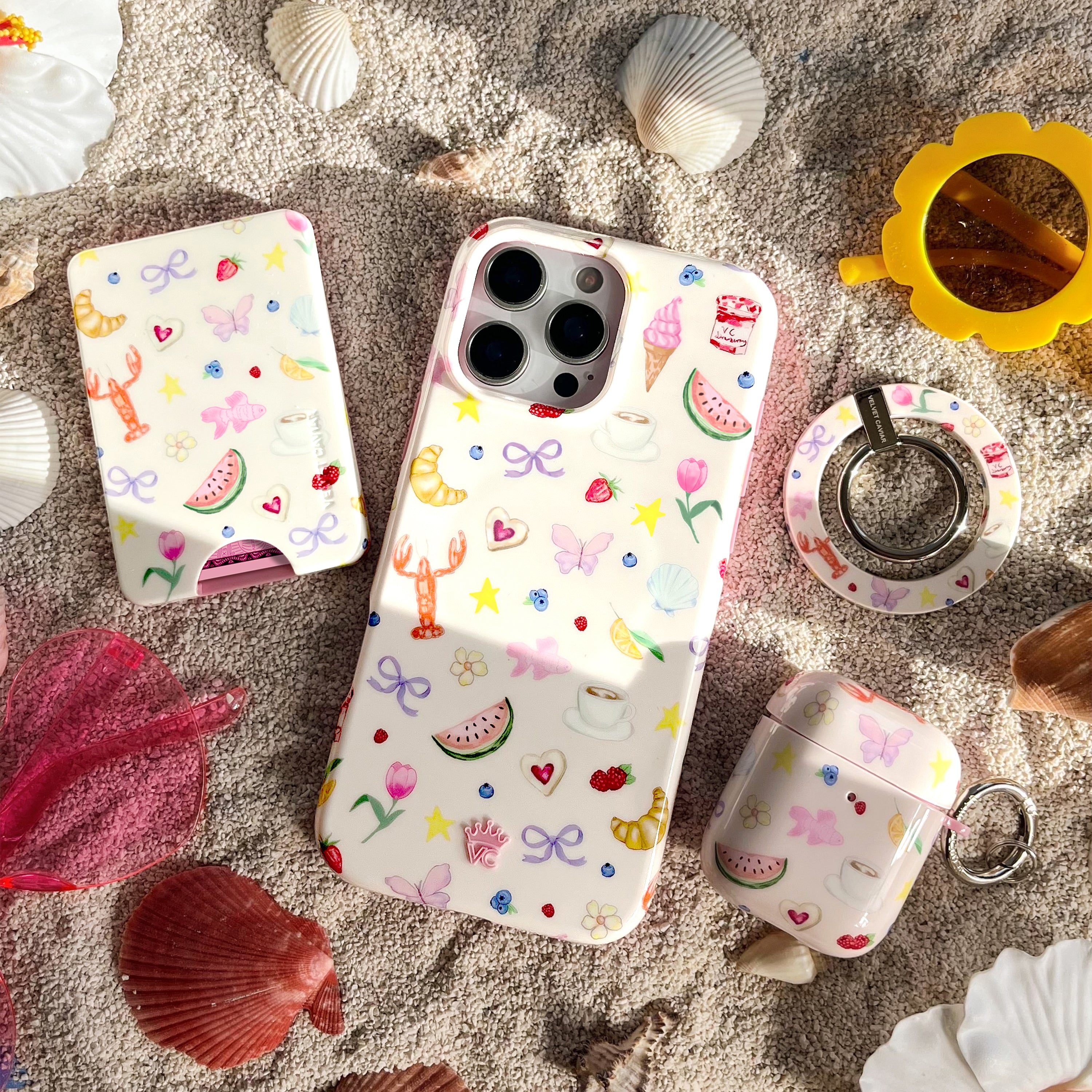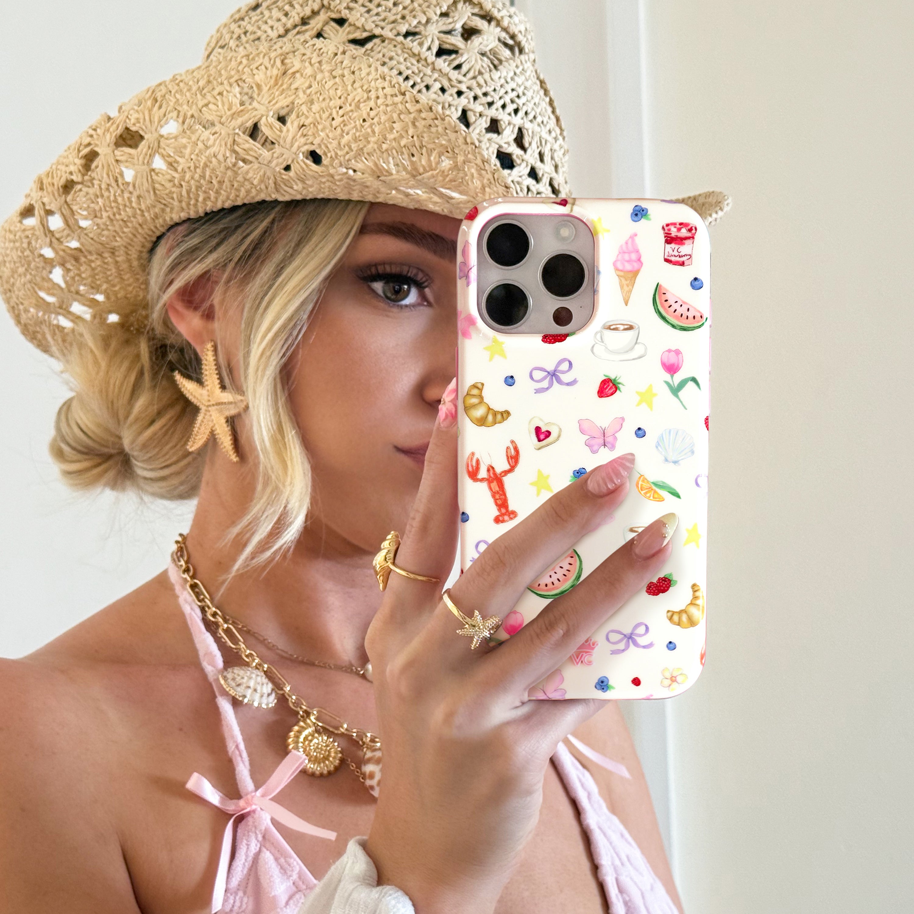 Girls just wanna have sun! This glossy MagSafe phone case is inspired by the perfect summer from the beach to the boardwalk and back again with a neutral base and pink bumper!