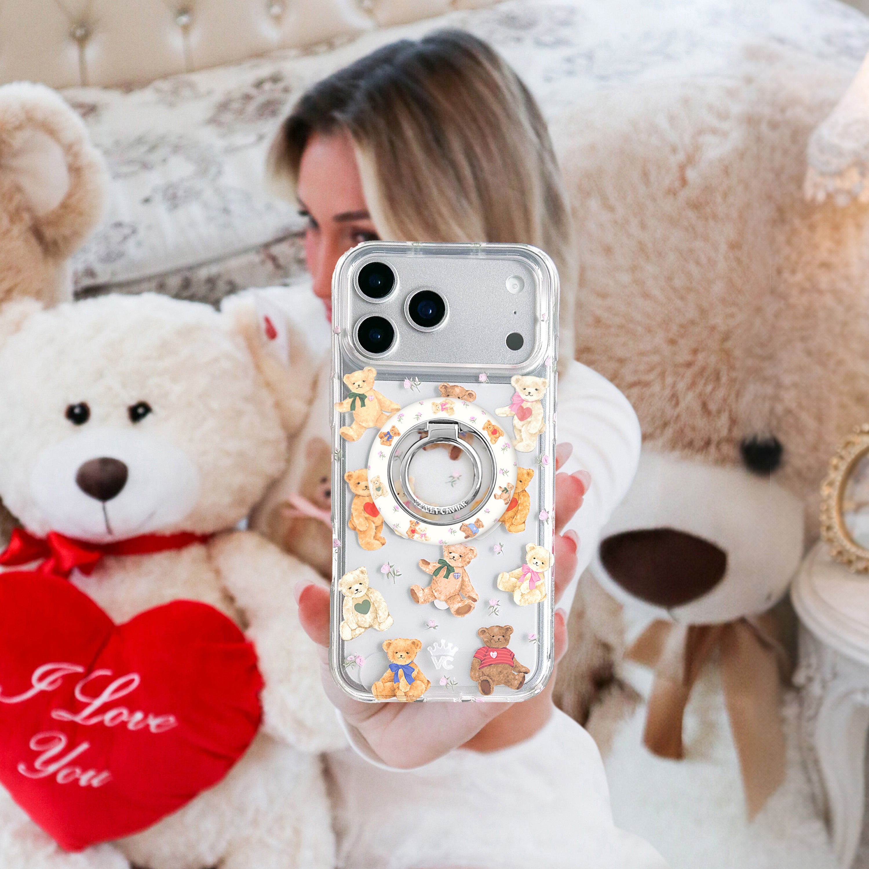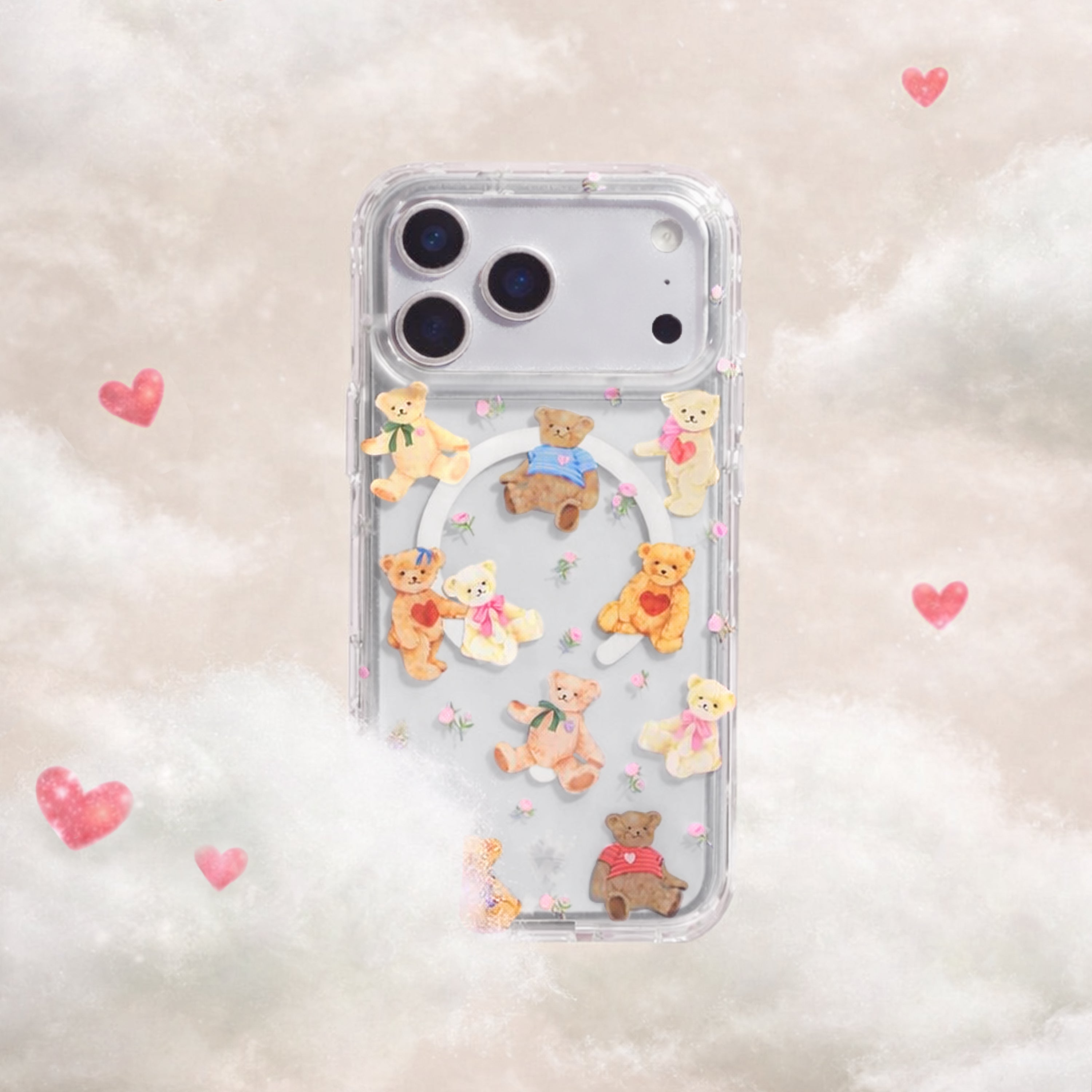 Where cute meets chic! This MagSafe case features a variety of hand drawn teddy bears and small dainty pink florals on a clear case.