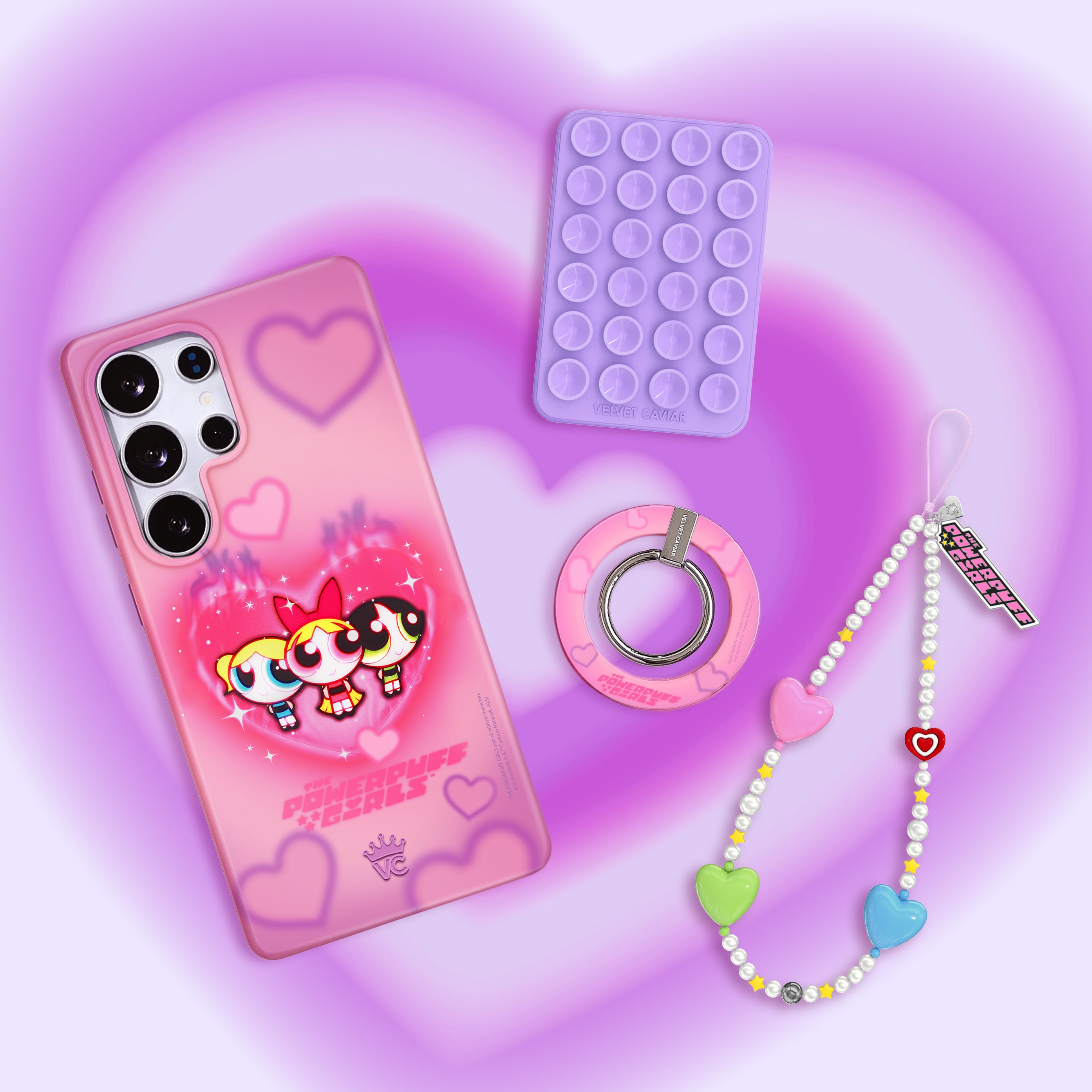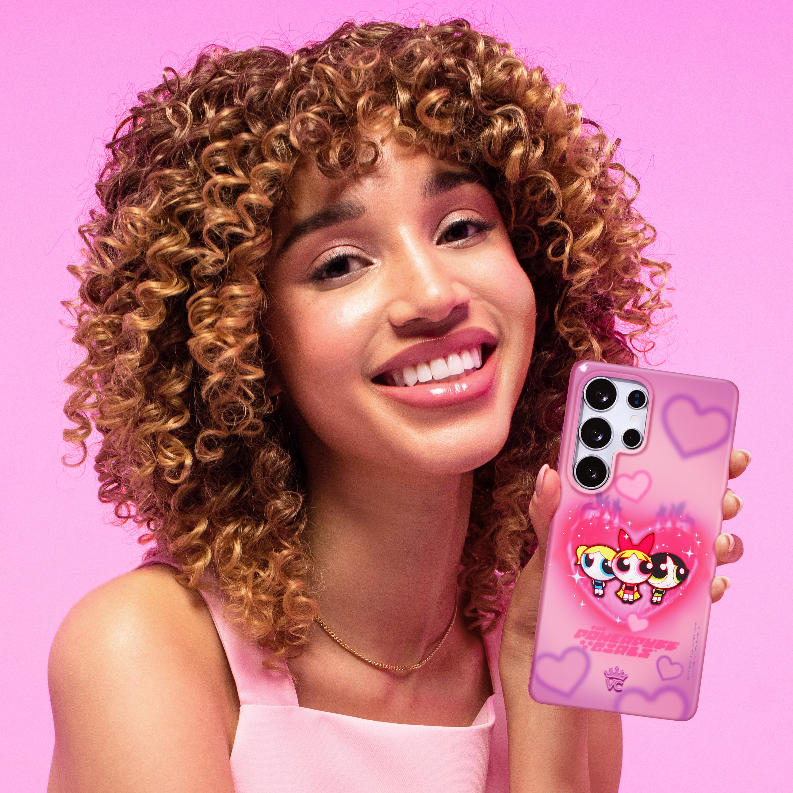 Sugar, Spice, and Everything Nice! This protective case features Blossom, Bubbles, and Buttercup front and center with an array of airbrush hearts on a glossy pink and purple ombre base.
