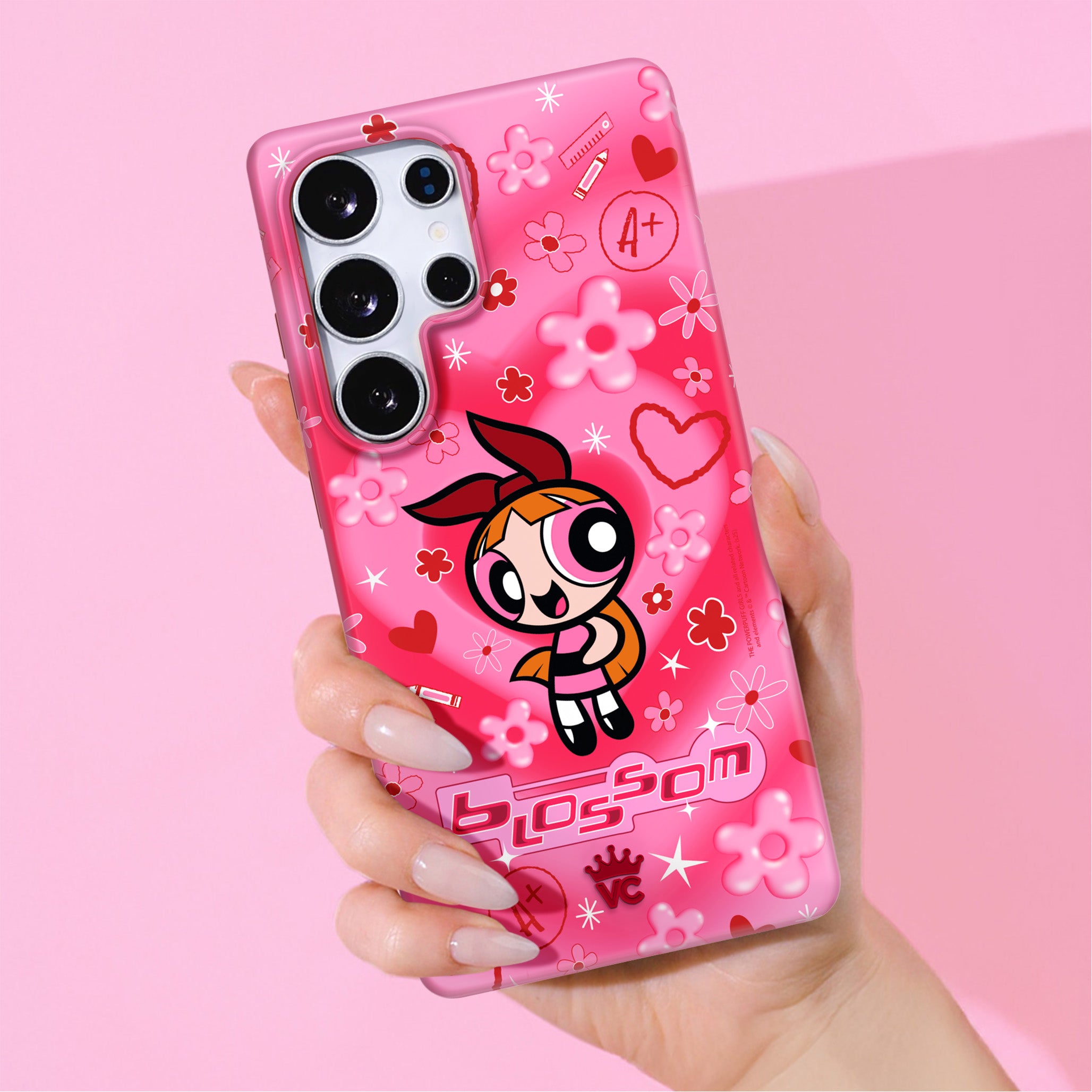It's Blossom! This glossy protective case features Blossom front and center with flowers and hearts sprinkled throughout all on a radiating pink and red heart background.