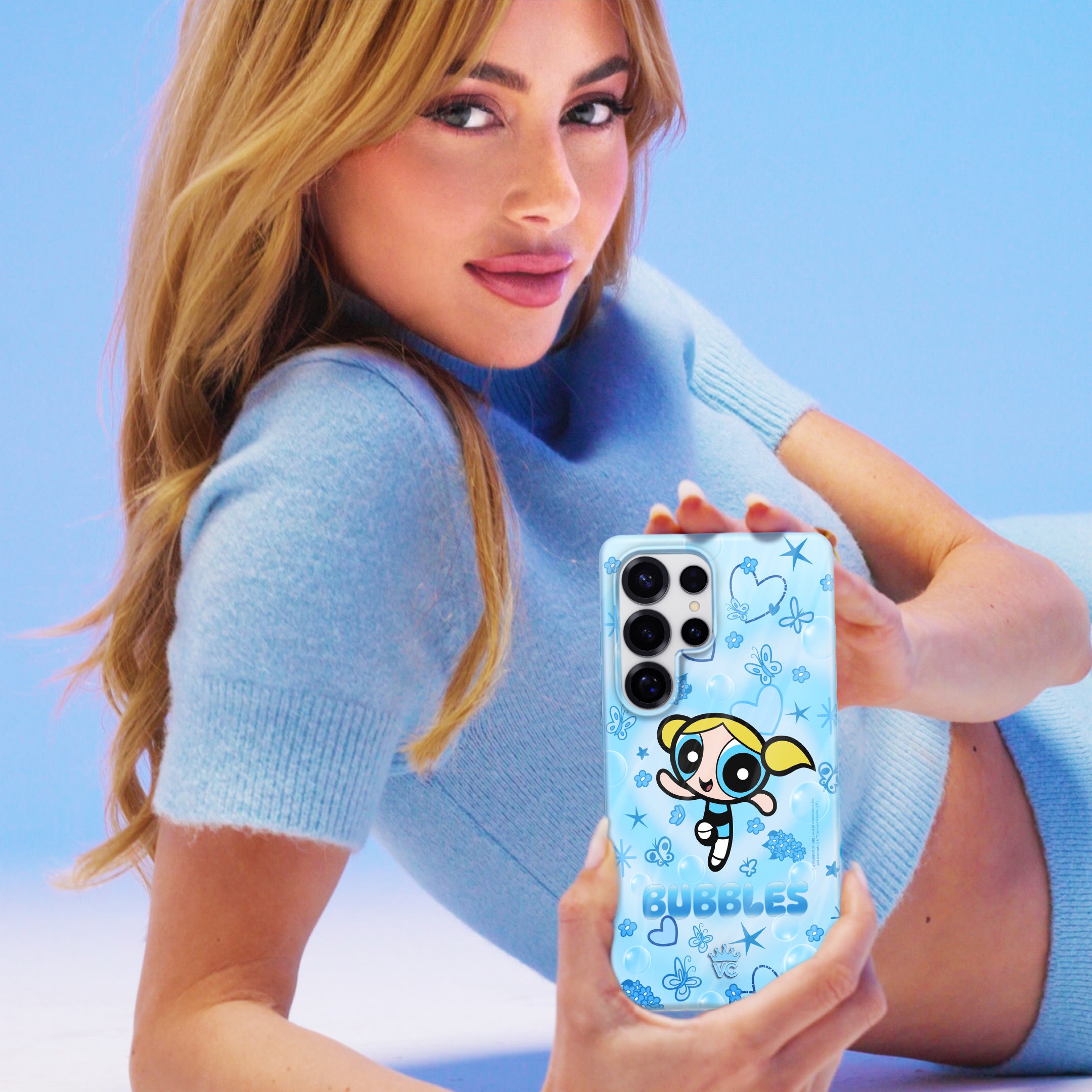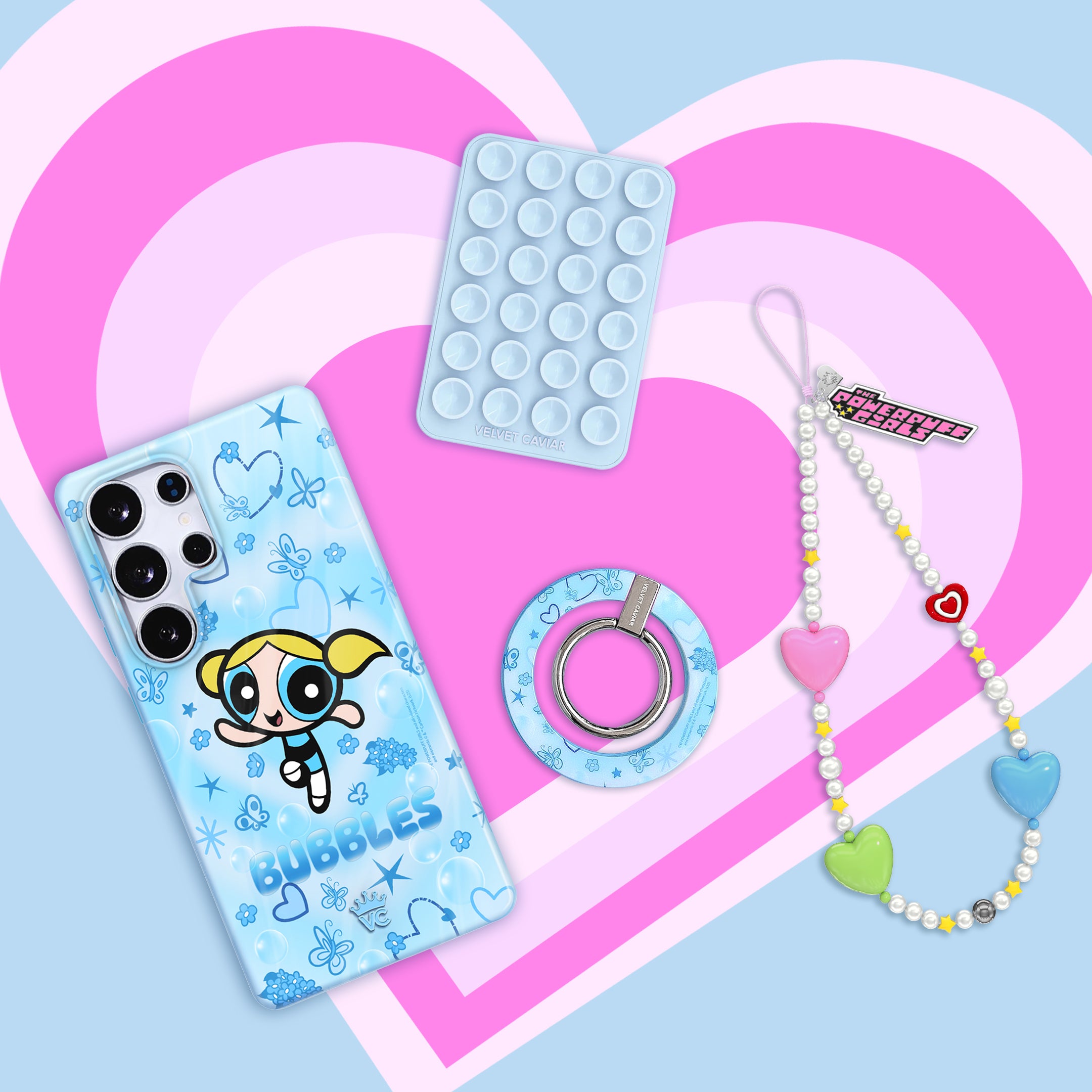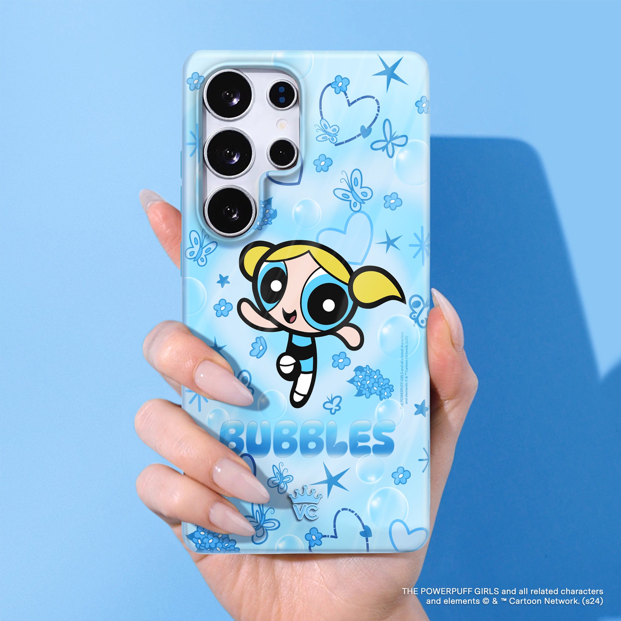 It's Bubbles! This glossy protective case features Bubbles front and center with bubbles, butterflies, and hearts sprinkled throughout all on a radiating heart background in various shades of blue.