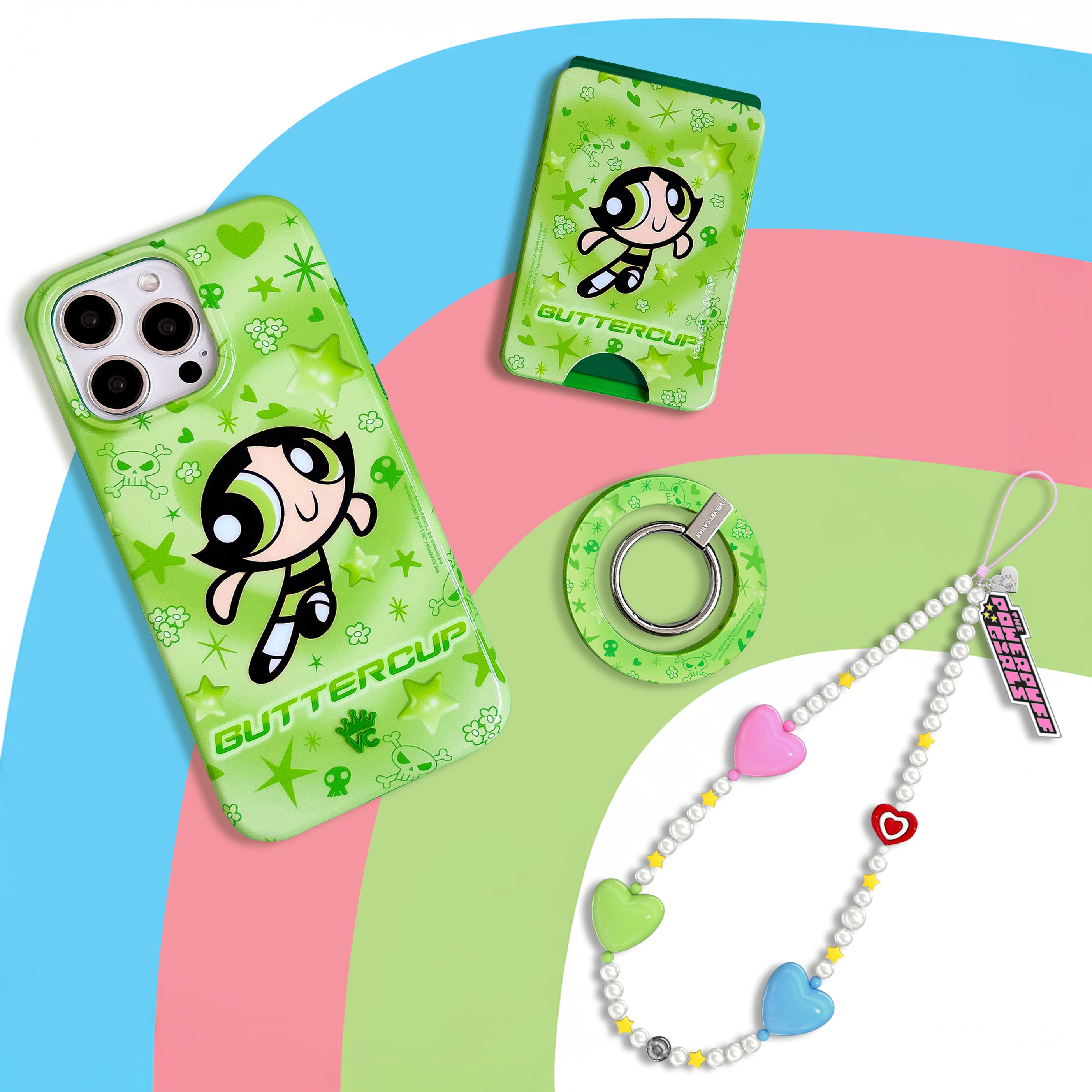It's Buttercup! This glossy MagSafe case features Buttercup front and center with stars, skulls, and hearts sprinkled throughout all on a radiating heart background in various shades of green.