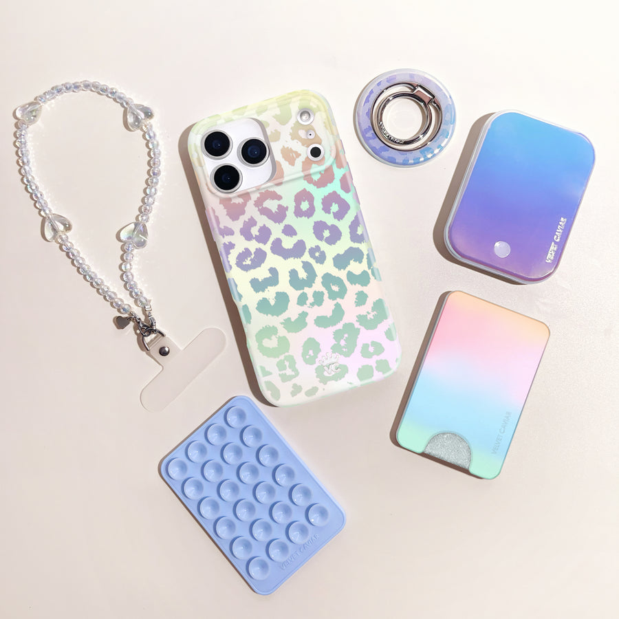 This Collector's Edition protective phone case features glossy leopard spots on an iridescent opal base.